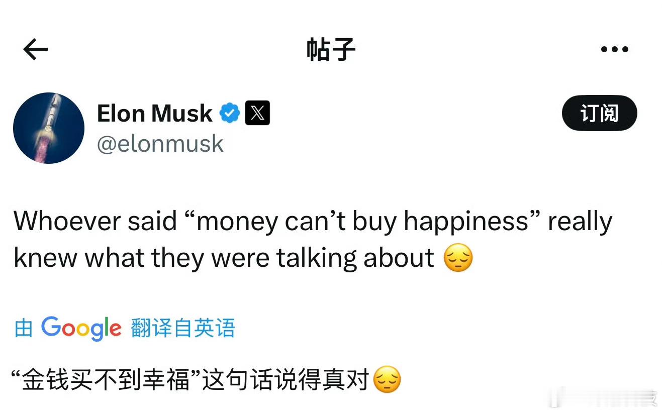 马斯克:“金钱买不到幸福”这句话说得真对。