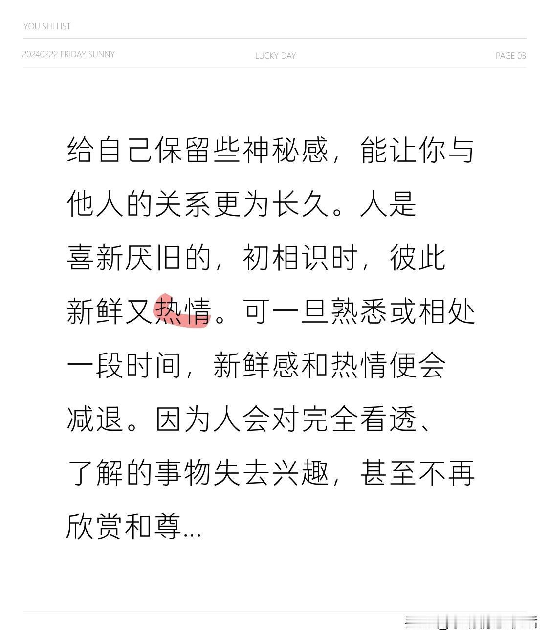 给自己保留些神秘感,能让你与他人的关系更为长久。 人是喜新厌旧的,初相识时,彼此新鲜又热情。 可一旦熟悉或相处一段时间,新鲜感和热情便会减退。 因为人会对完全看透、了解的事物失去兴趣,甚至不再欣赏和尊重。 所以,别轻易向他人展露全部,这并非刻意隐瞒或虚伪,而是给自己留神秘感和底牌,以免他人很快对你失去兴趣。过度展示自己,会让别人对你失去期待与想象空间。 人际交往分寸 朋友的距离感
