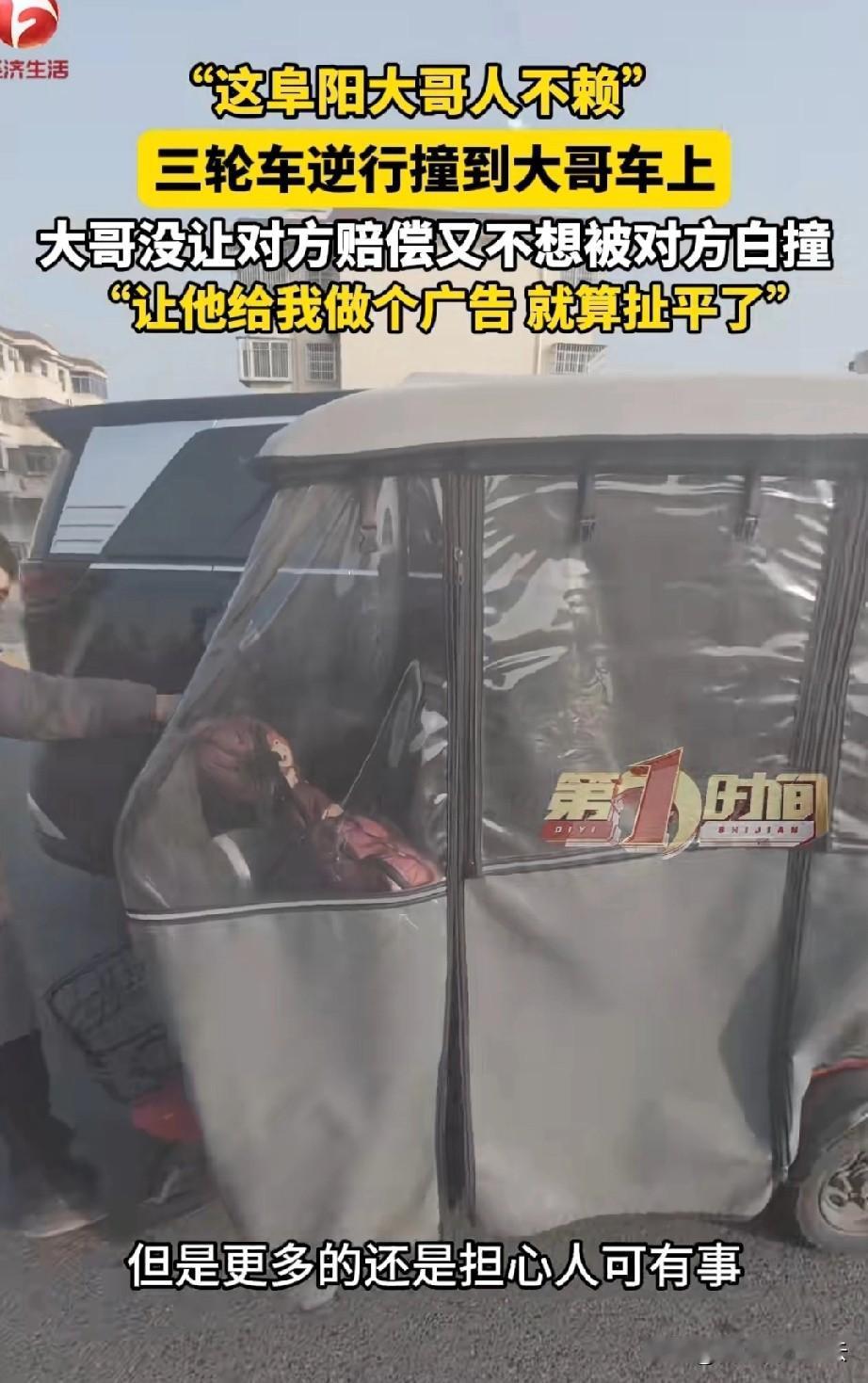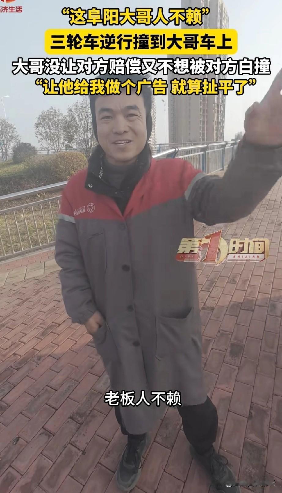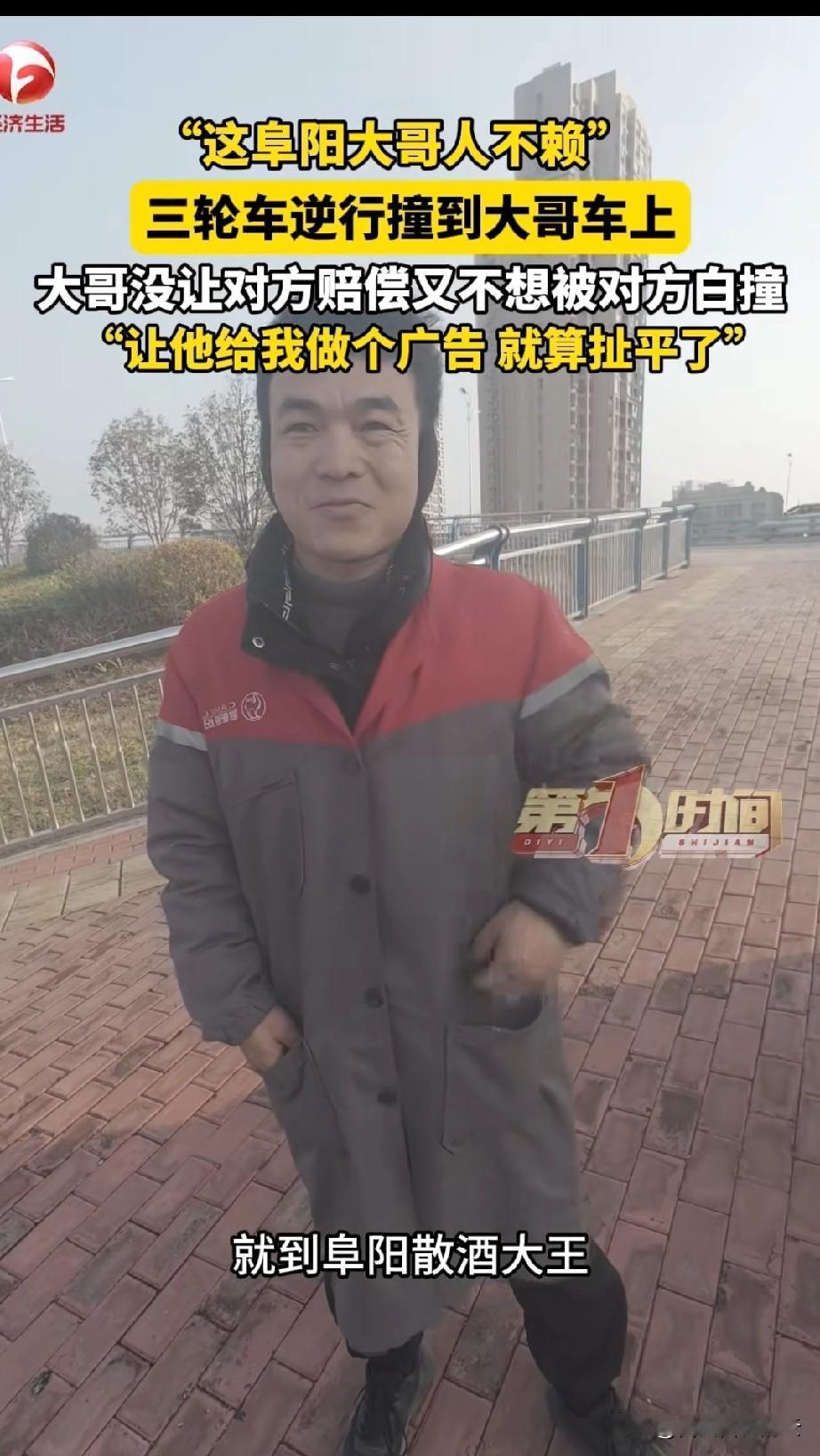老板大格局!安徽阜阳,一男子开车时被逆行的三轮车撞到,三轮车把他车上的车衣都给刮花了,如果修理的话,一面车身得1500块,刮花了三面,就得4500块。 男子看开三轮车的男子穿着朴素,大概是个送货的,应该也没多少钱。再说那个男子看到他的车被刮花后虽然很紧张,但没有逃避,一直道歉说可以赔偿。男子看他态度好,就有点心软了,他觉得这4500块都让他赔的话,可能对他来说确实很吃力。 但是这是三轮车司机的过错,他又不想就这么放过他。 他想出一个主意,他是卖散酒的,让三轮车司机帮他打个广告,来抵消赔偿。三轮车司机一听很惊喜,有点羞涩的对着镜头说,来阜阳买散酒,就找阜阳散酒大王,老板人不赖。 说完,两人都笑了。 有网友说,老板大格局,活该他发财。 我觉得这个广告一定会大火的,老板人品不错,酒的质量肯定也是杠杠的,有需要的可以去老板那里拿酒。