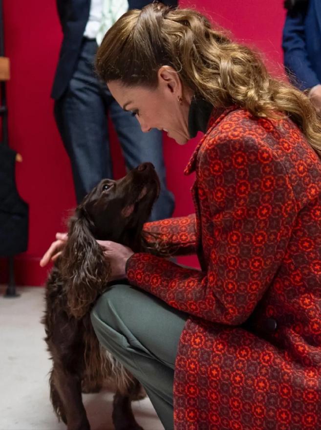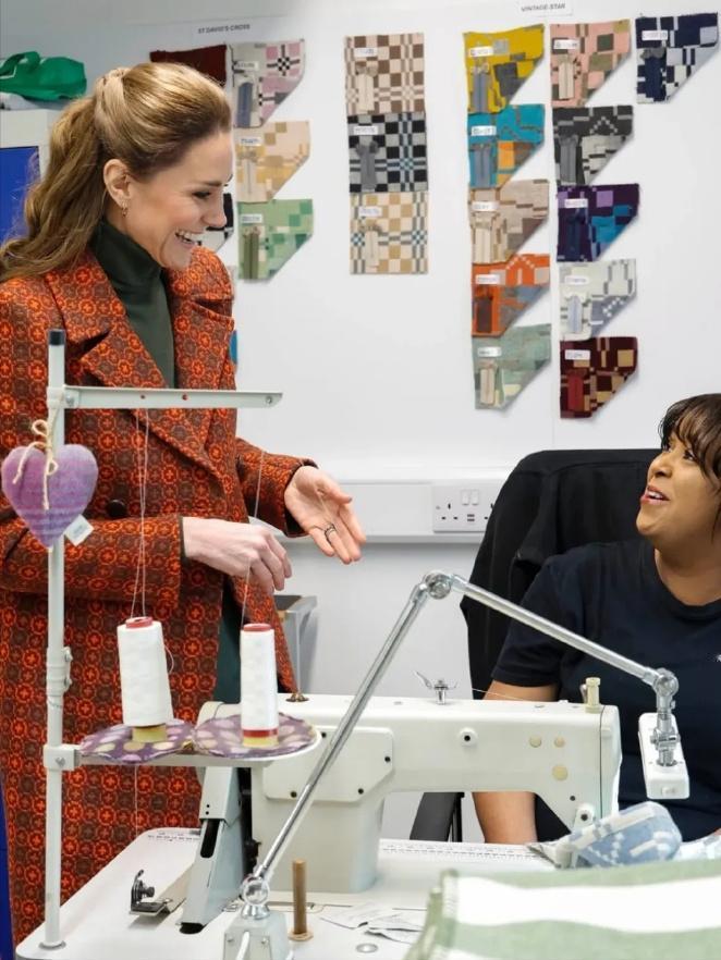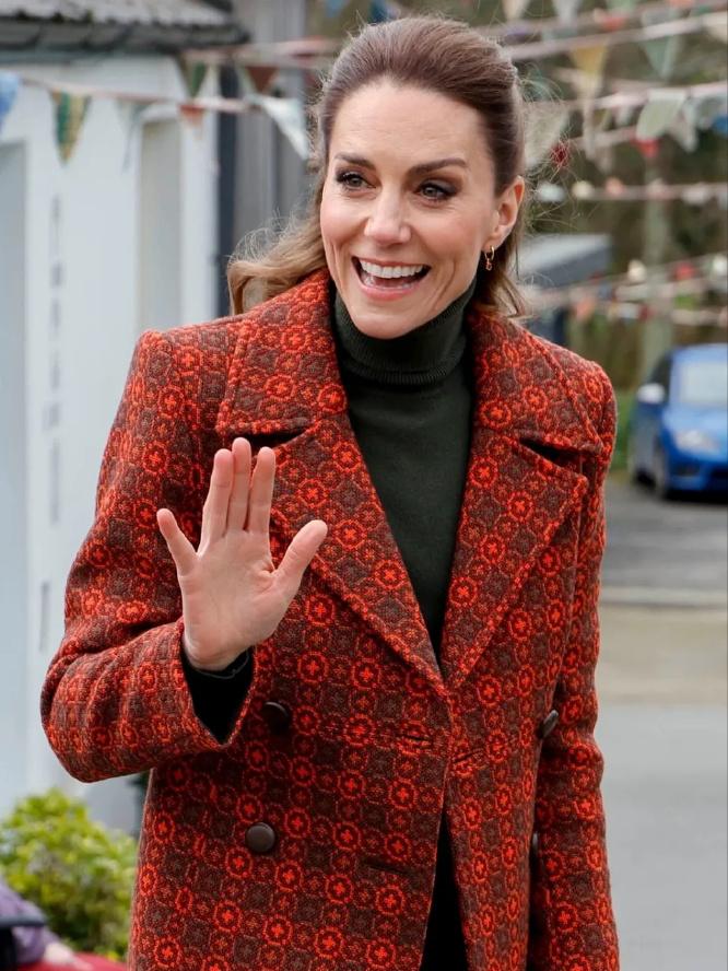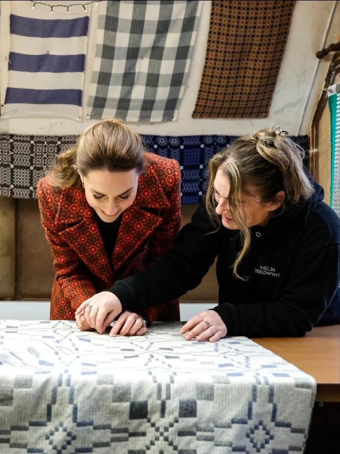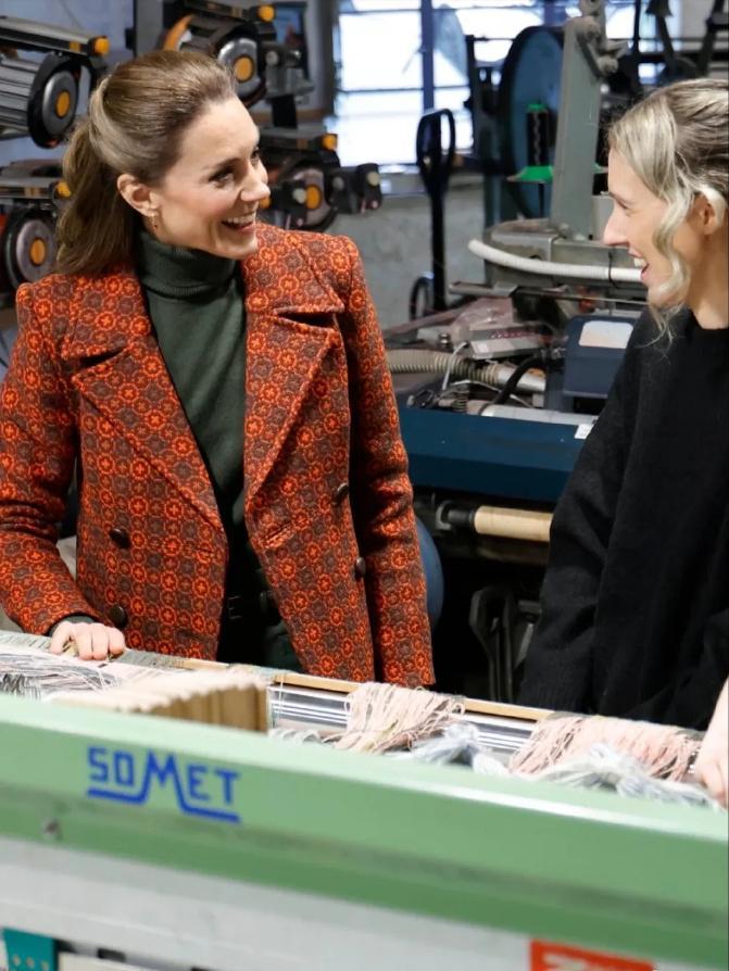 凯特王妃访问威尔士纺织厂![耶] 这次是全新的花纹中长大衣, 铁锈红色配墨绿内搭还挺新颖的, 凯特近几年都选择单色或格纹大衣了, 类似的花纹大衣起码可以追溯到十年前[捂脸]