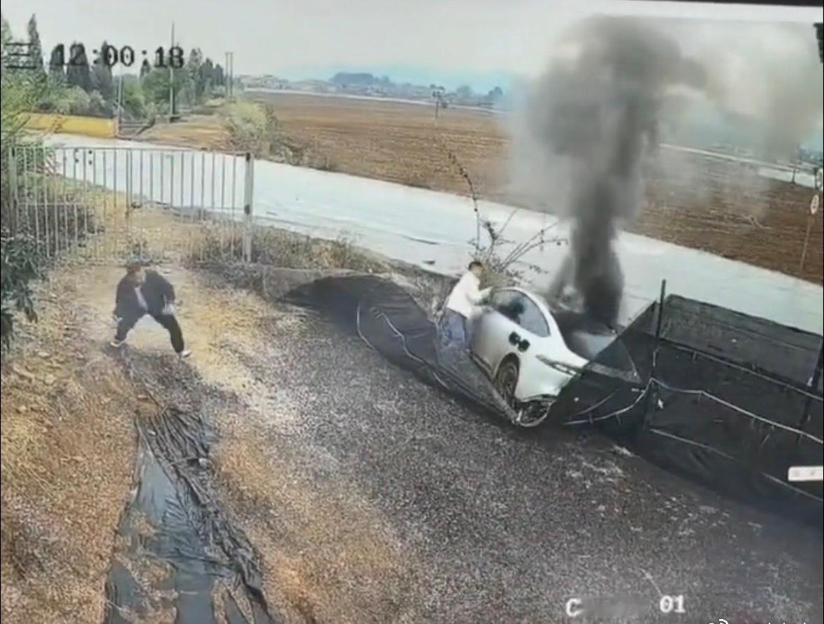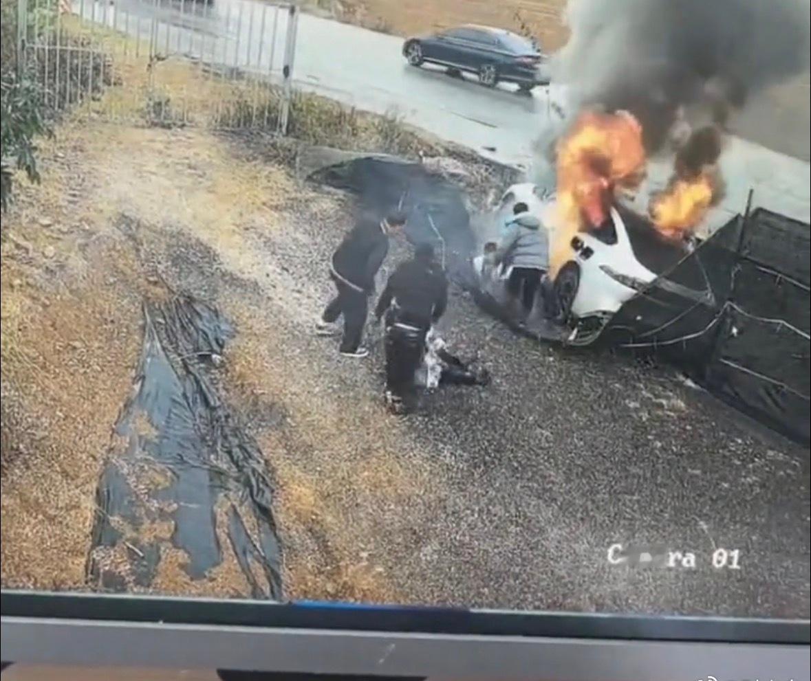 电车发生事故,底盘起火1分钟的救援行动!路过的白衣男子实施援救烧伤,可否获得见义勇为奖励? 网上有人发出来某国产品牌电车网约车在某个乡村小路上行驶,可能是司机对于乡村小路不够熟悉,从视频里看起来是拐弯路段,出现了打滑。从视频看出来司机打不开后车门车辆出现浓烟后开始慌乱!!! 幸亏这个时候路过的白衣男子从路边搬来砖头砸烂后窗,在不到40秒内救出了3名后排乘客! 无奈车辆燃烧速度太快,副驾驶的乘客没有机会被救出来 现在这几名伤者仍在院治疗,救人白衣男子也烧伤救助。 建议家里有电车的一定要在车里储物柜放一个救生锤,必要的时候一定要破窗逃生!