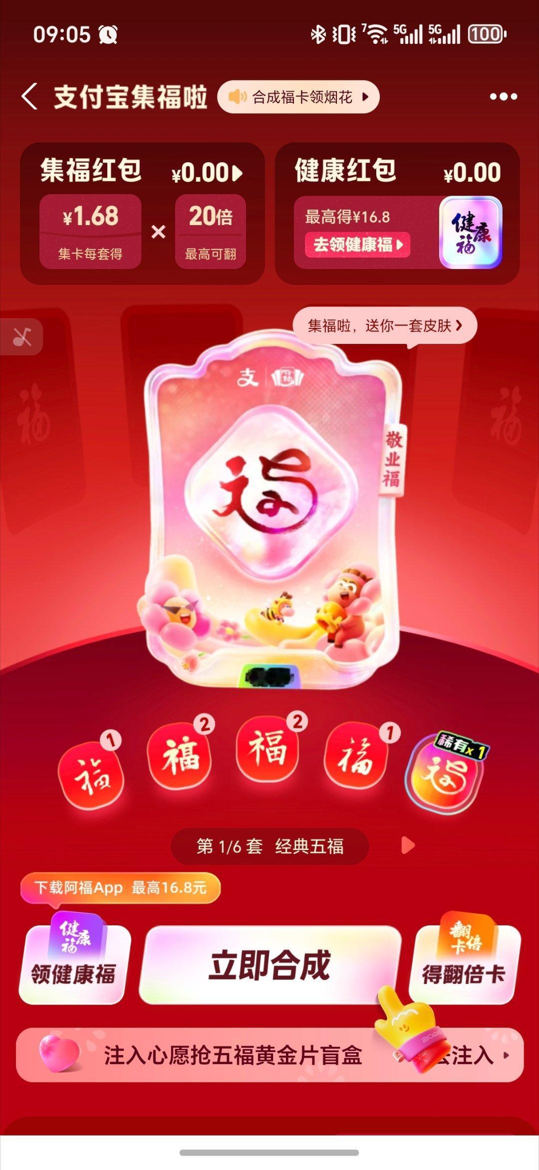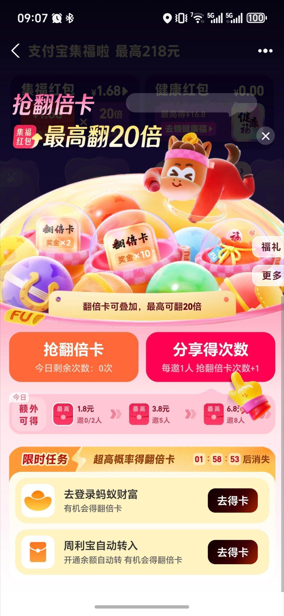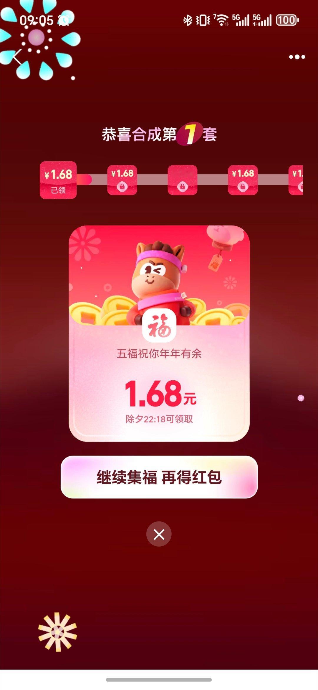 今年的支付宝集五福,套路变了!我都没咋弄,今天点开告诉我集齐了直接公布金额1.68元。还可以继续叠加,还能拉人头翻倍。