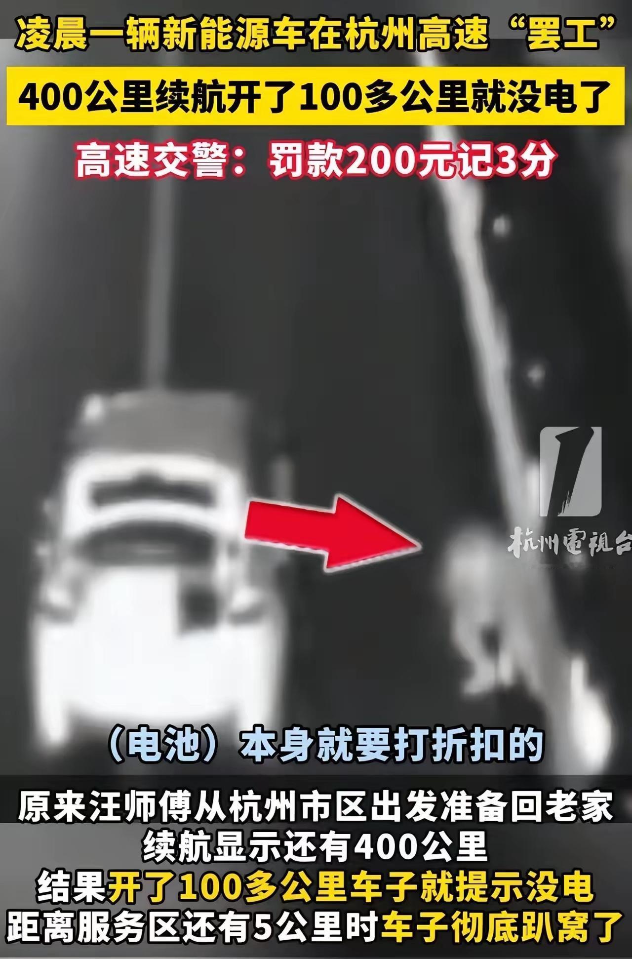 凌晨,一辆新能源车在杭州高速"罢工"!司机:“去年买的车,400公里续航开了100多公里就没电了!”高速交警:罚款200元记3分!网友:吓得我不敢买电车了!开电车能出远门吗? 这事具体是这么回事。那位司机去年新买的新能源车,官方标的续航是400公里,结果那天在杭州高速上,才跑了100多公里就突然没电“罢工”了。车子直接停在高速上,这多危险啊,后面的车稍不注意就可能追尾。高速交警来了之后,按规定给司机开了200元罚款,还记了3分。毕竟在高速上随意停车,不管啥原因,都是违反交通规则的。这事儿一传开,网友们炸开了锅,好多人都在说,这哪敢买电车啊,跑个远门心里都没底。 其实这几年新能源车火得很,大家图它省钱、环保,市区里开着确实挺方便。但一说到跑长途,不少人心里就打鼓,这次杭州高速这事,算是把大家的顾虑又摆到了台面上。为啥标的400公里续航,实际才跑100多公里?这里面原因可能不少。比如天冷或者天热开空调,会特别费电;车子载重多了,也费电;还有就是电池用久了,续航本身就会下降。但不管咋说,续航虚标或者司机预估不足,导致高速抛锚,这都不是小事。 有人说,这得怪车企,续航标的太夸张,实际跑起来根本达不到,这不坑人吗?也有人觉得,司机自己也有问题,跑高速前不知道充满电,不知道提前规划好充电的地方。其实啊,这事儿两边都有点责任。车企确实得实在点,别为了卖车就瞎吹续航,真实续航多少就标多少,让消费者心里有数。而司机呢,开电车跑长途,确实得比开油车更上心,提前看好路线上的充电桩,估算好能跑多远,别等没电了才着急。 现在新能源车越来越多,配套的充电设施也得跟上才行。要是高速上充电桩密密麻麻,随处都能充,那估计也没多少人会怕开电车出远门了。说到底,不管是车企、相关部门还是司机自己,都得为新能源车跑长途这事多上点心,这样大家开着才安心。 各位读者你们怎么看?欢迎在评论区讨论。