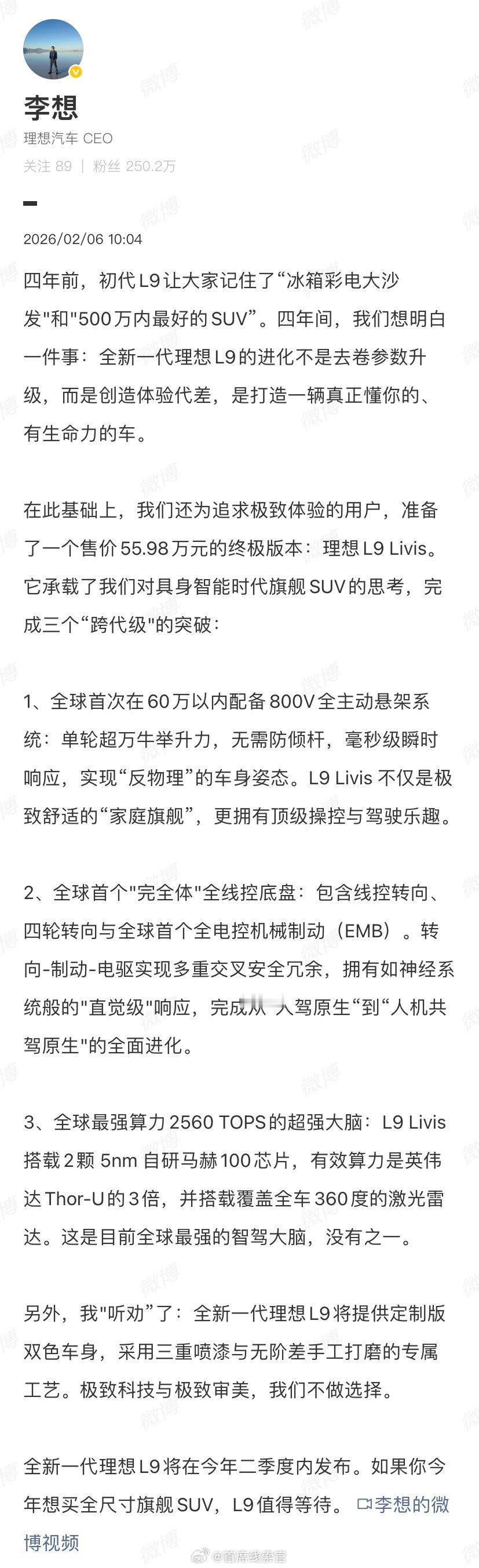 李想宣布:全新一代理想 L9 为追求极致体验的用户,准备了一个售价 55.98 万元的终极版本:理想 L9 Livis。