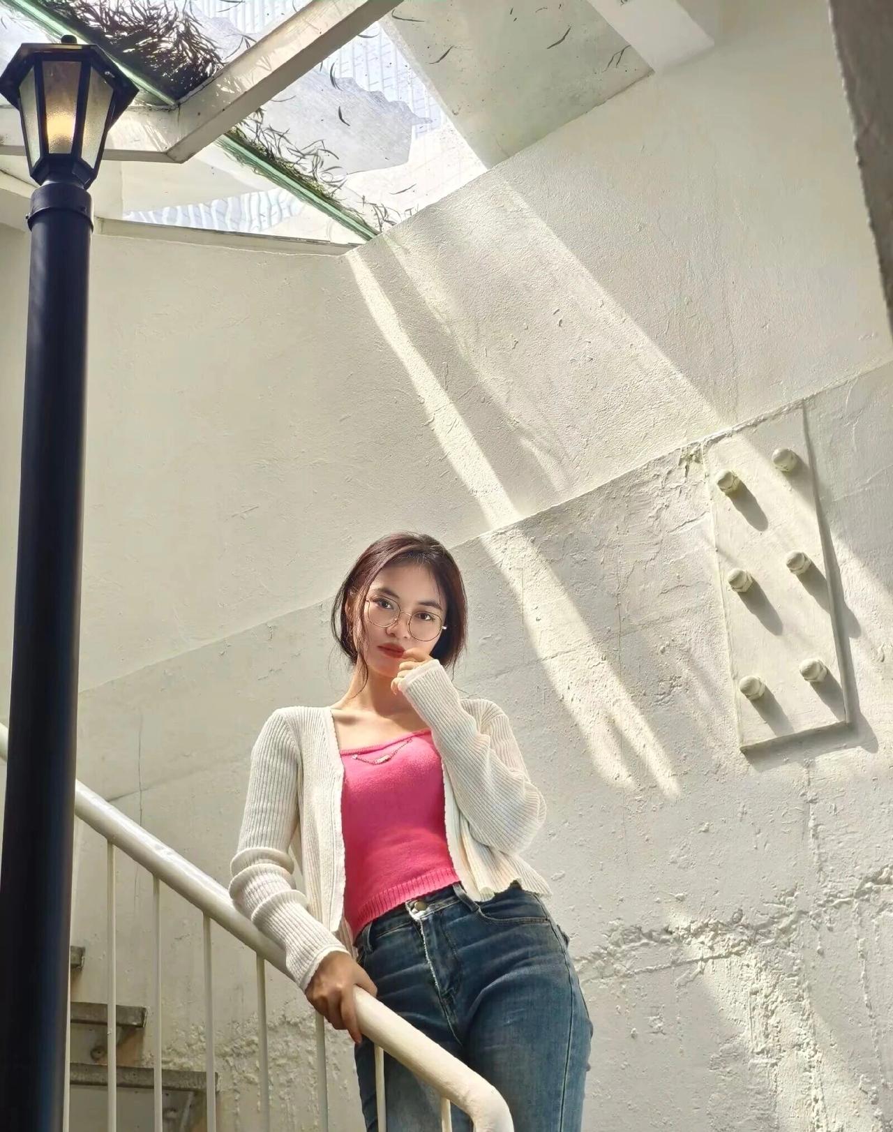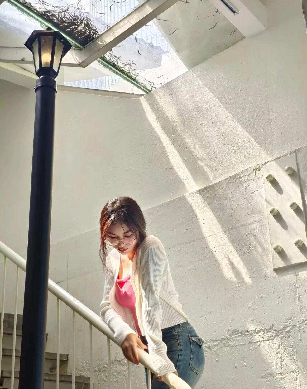站在楼梯拍写真的女子,阳光洒落,倚栏或微笑,或低眉,岁月静好。牛仔裤穿搭风格就是这样迷人写真 牛仔裤