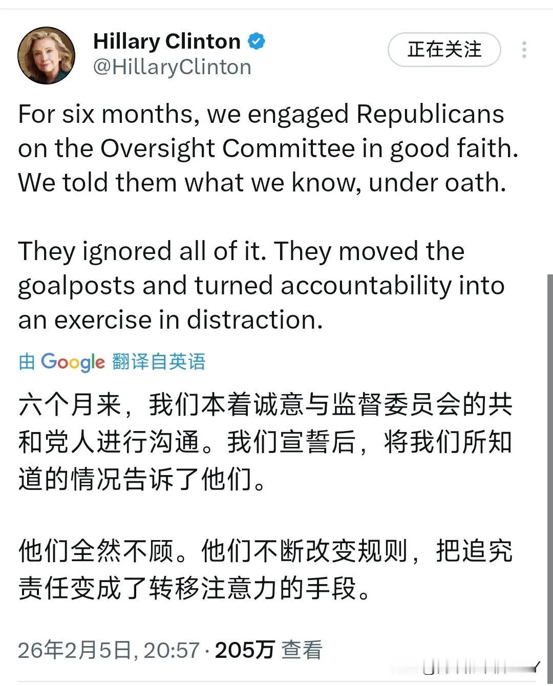 希拉里·克林顿怒了!2月5日晚,这位美国前国务卿写下段火气十足的话:“六个月来,我们带着诚意跟监督委员会的共和党人沟通。宣了誓,把知道的都说了。 他们当耳旁风,还变着法改规则,把追责变成转移注意力的把戏。别玩了詹姆斯·科默(共和党众议院监督委员会主席),想斗就明着来。你不是总说透明吗?公开听证会全程直播,还有比这更透明的?我们奉陪到底。” 这怒火看着是冲共和党改规则来的,说到底,不过是美式党争里“狗咬狗”的戏码。希拉里喊着“诚意沟通”,可她政治生涯里的“邮件门”之类的烂事,哪件不是明晃晃的劣迹? 所谓诚意,早被自己的黑料啃得千疮百孔。如今跳出来叫板公开听证,不过是拿“透明度”当幌子,想把火烧到别人身上,给自己找条活路。 有意思的是另一边,比尔·克林顿倒是喊着要无条件公开所有爱泼斯坦案文件,追求彻底透明。这话听着倒在理。那些文件本就不该被特朗普攥在手里摆弄,真要全抖出来,说不定能把美国权贵圈子的遮羞布撕个稀烂。 可这夫妻二人,一个跳脚骂规则,一个喊着要公开,倒像唱双簧,各有各的算盘。美式政坛这点事,翻来覆去就是那套。听证规则说改就改,跟小孩过家家似的;权贵们的丑闻藏着掖着,不到万不得已绝不露头。 两党整天你撕我咬,唾沫星子横飞,看似争得是“公正”“真相”,实则都是为了自家那点选票和权力。谁真把老百姓的事放在心上?不过是借着“监督”“调查”的由头,互相拆台罢了。 希拉里骂共和党“转移注意力”,她自己何尝不是?当年“邮件门”闹得沸沸扬扬,她不也想方设法遮掩,把责任推来推去?如今轮到自己被刁难,就喊着“公开”“透明”,这不是五十步笑百步是什么? 老话说“乌鸦落在猪身上,只看见别人黑”,美式政客的双标,玩得比谁都溜。爱泼斯坦案的文件,就像块烫手山芋。特朗普想捂着,大概是怕牵连自己;比尔·克林顿想公开,说不定是觉得里面没自己什么事,还能顺便给对手添堵。 可不管谁喊得再响,这文件背后藏着的权贵龌龊,怕是没那么容易见光。毕竟,那圈子里的人,牵一发而动全身,真要全曝光,美国政坛怕是要地震。国际社会看着这场闹剧,多半也就当个瓜吃。 美式民主喊了这么多年,到头来暴露的全是内部的腌臜。规则是摆设,丑闻是常态,两党斗得越凶,越让人看清这制度的虚头巴脑。所谓“公开听证”,到头来可能又是一场作秀,摄像机对着又怎样?该藏的还是会藏,该演的还是会演。 希拉里的暴怒,不过是这场大戏里的一个小高潮。她喊着“来打一架”,看似强硬,实则也是被逼到份上的挣扎。真要公开听证,她就不怕自己的老底被翻出来?说到底,都是政客的算计,没什么新鲜的。 美式党争这出戏,还得接着演下去。你骂我耍手段,我揭你老底,互相耗着,把国家大事晾在一边。老百姓看得眼花缭乱,却发现日子该咋过还咋过,没谁真为他们谋福利。这样的“民主”,与其说是制度,不如说是场永无止境的内斗。 至于最后结局?大概率是吵来吵去,不了了之。文件该藏的还藏着,规则想改还改着,两党接着互相甩锅。国际社会的瓜吃完了,该干嘛干嘛。毕竟,美式政坛的龌龊,早就见怪不怪了。希拉里·克林顿 希拉里 爱泼斯坦案是否会影响美国政治 特朗普回应爱泼斯坦案:我是清白的