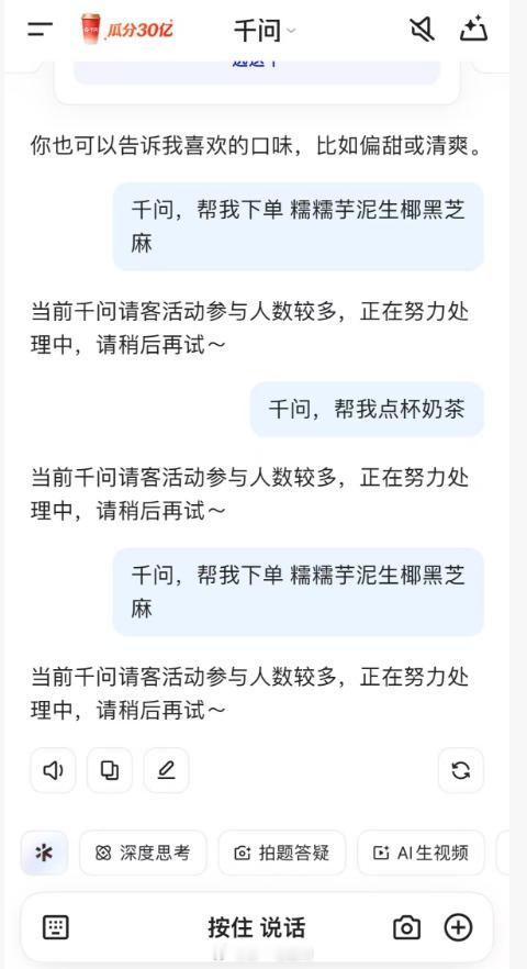 千问回应免费奶茶活动 本来想体验一下AI智能体的便利,结果。。。。
