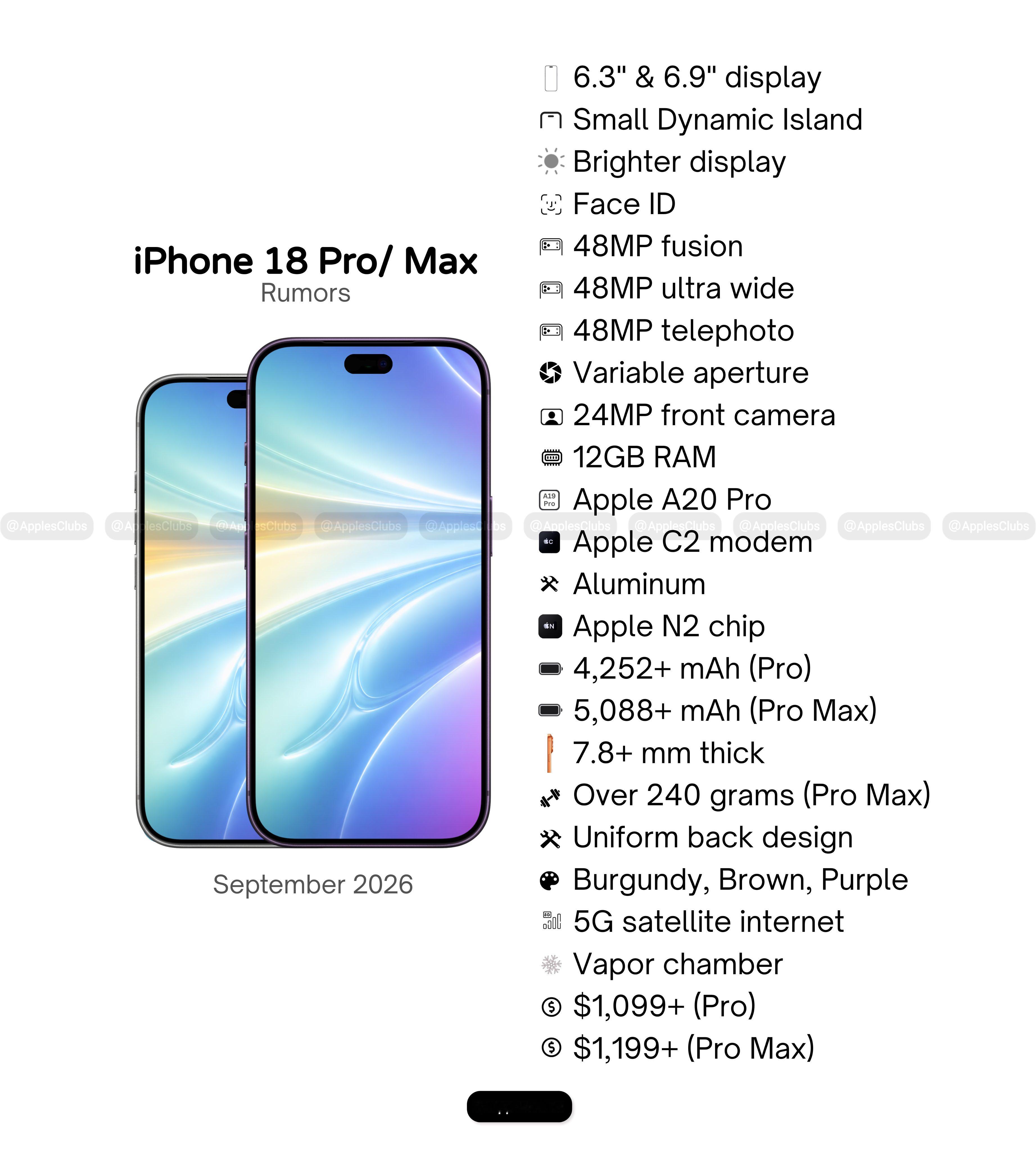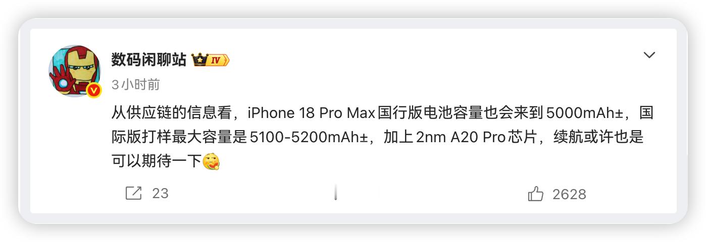 说是 iPhone 18 Pro Max 上了 5000mAh + 的电池,再搭配 2nm A20 芯片,这波续航看着挺猛,理论上确实能打。但咱也别被“史上最强”忽悠了,毕竟年年都这么喊。跟安卓动辄 7000mAh、8000mAh 的比,这容量其实一般,充电估计也没大长进,而且估计又得重回“半斤机”行列。iPhone18ProMax或是续航最强苹果机
