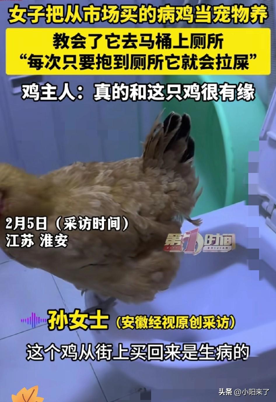 成精了! 淮安女子买鸡本来要炖汤, 结果养出一只会蹲马桶的“神仙鸡” 本来是只准备下锅的肉鸡,刚到家就蔫头耷脑生了病,女子没舍得扔,买药喂了整整一周,不仅救回小命,还天天收获热乎鸡蛋。 更让人意外的是,这鸡通人性到离谱,教一次就会蹲马桶上厕所,干净又省心。 从差点变炖汤,逆袭成家里团宠,这只鸡凭高情商彻底改写命运。有时候小动物带来的治愈,真的简单又直白,你多一分善待,它就还你十足的暖心陪伴。 城市养宠早就不局限猫狗,合得来、懂规矩,小鸡照样能当贴心小宝贝。