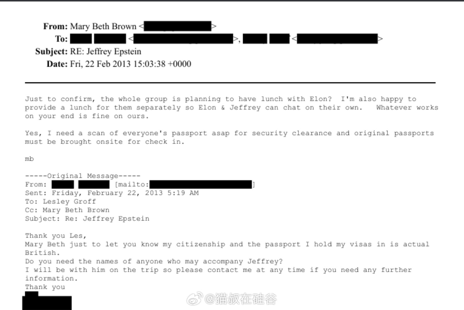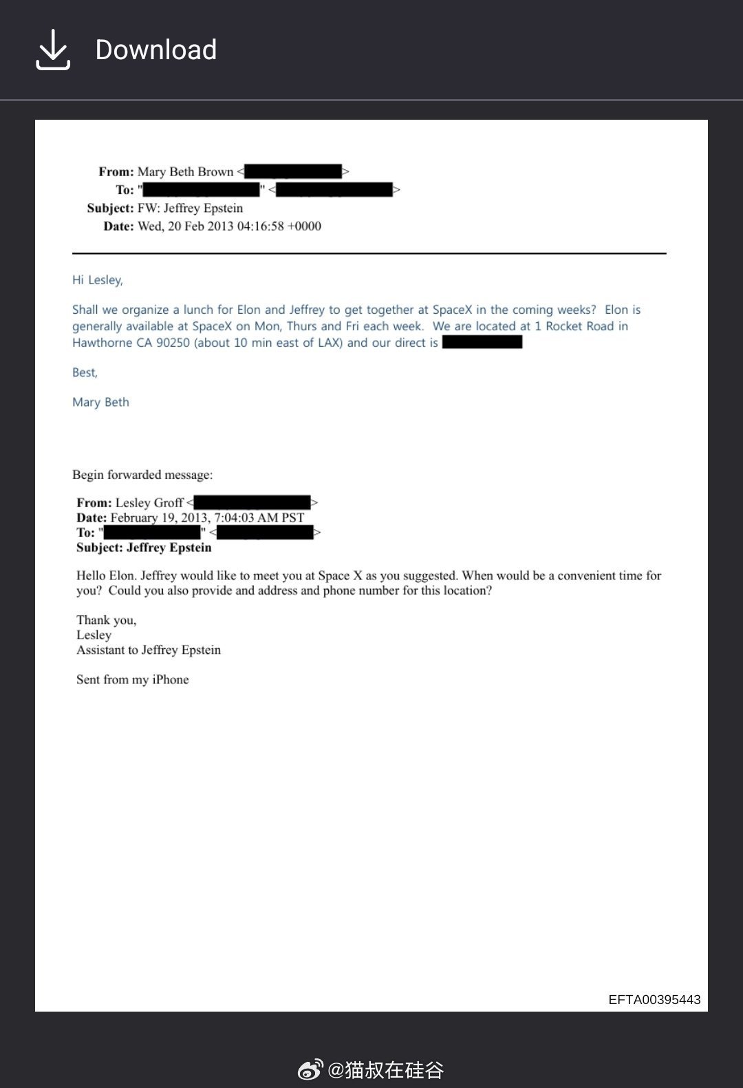 2013年2月,马斯克和爱泼斯坦的行政助理邮件来往显示,她们安排了爱泼斯坦一行人参观SpaceX,并计划与马斯克共进午餐。