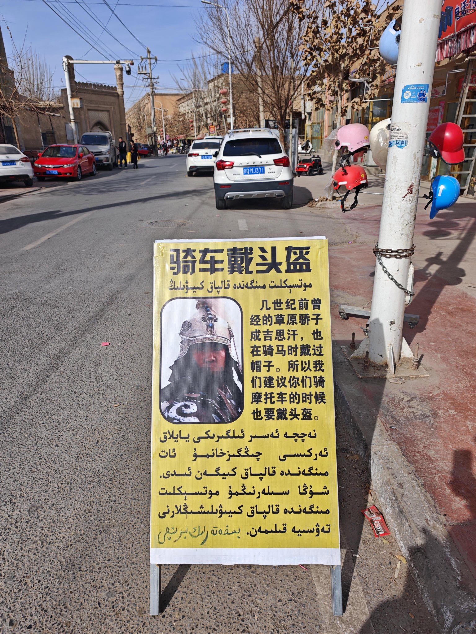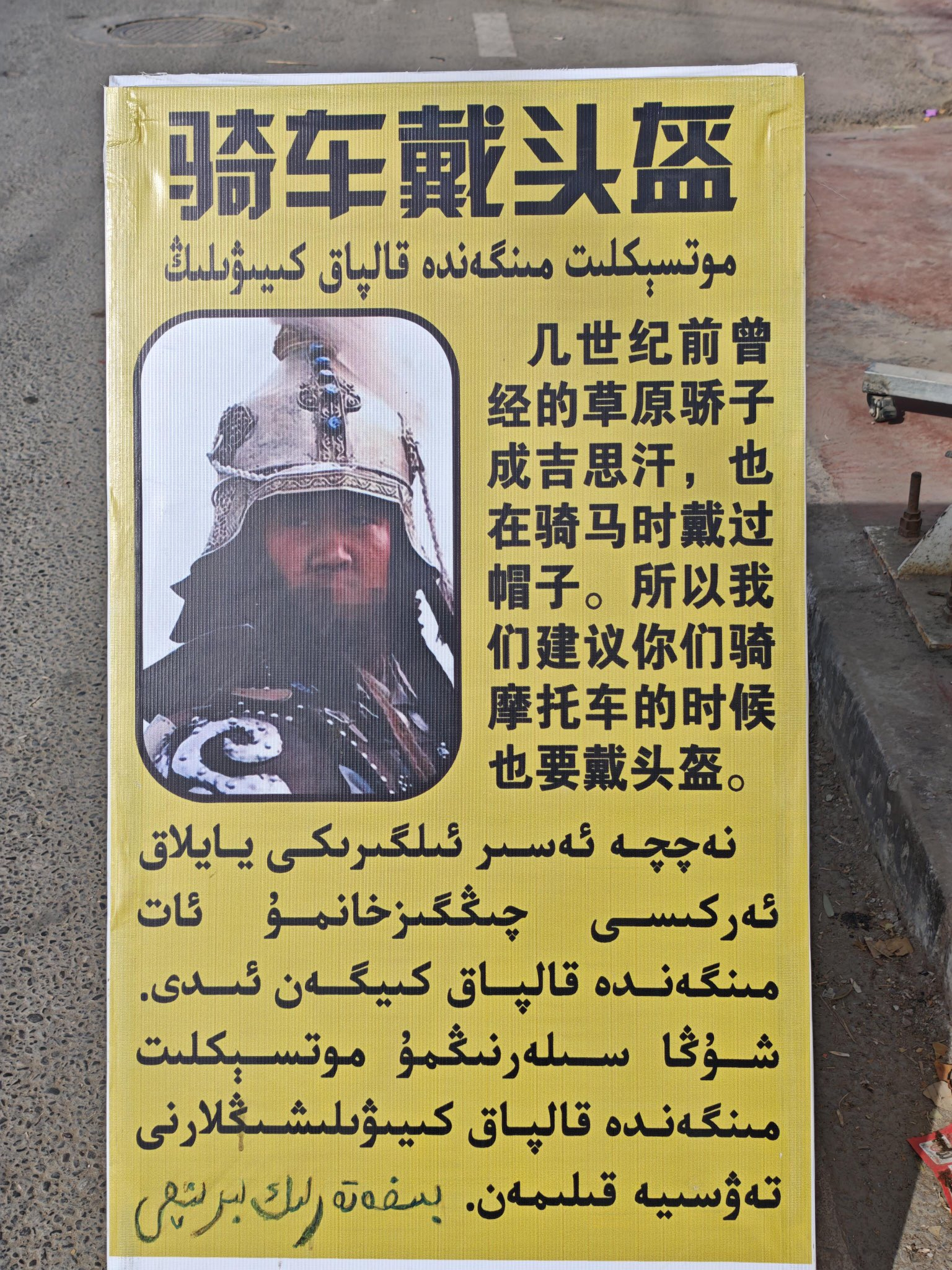 新疆莎车县维汉双语交通安全提示:“几世纪前曾经的草原骄子成吉思汗,也在骑马时戴过帽子。所以我们建议你们骑摩托车的时候也要戴头盔。”