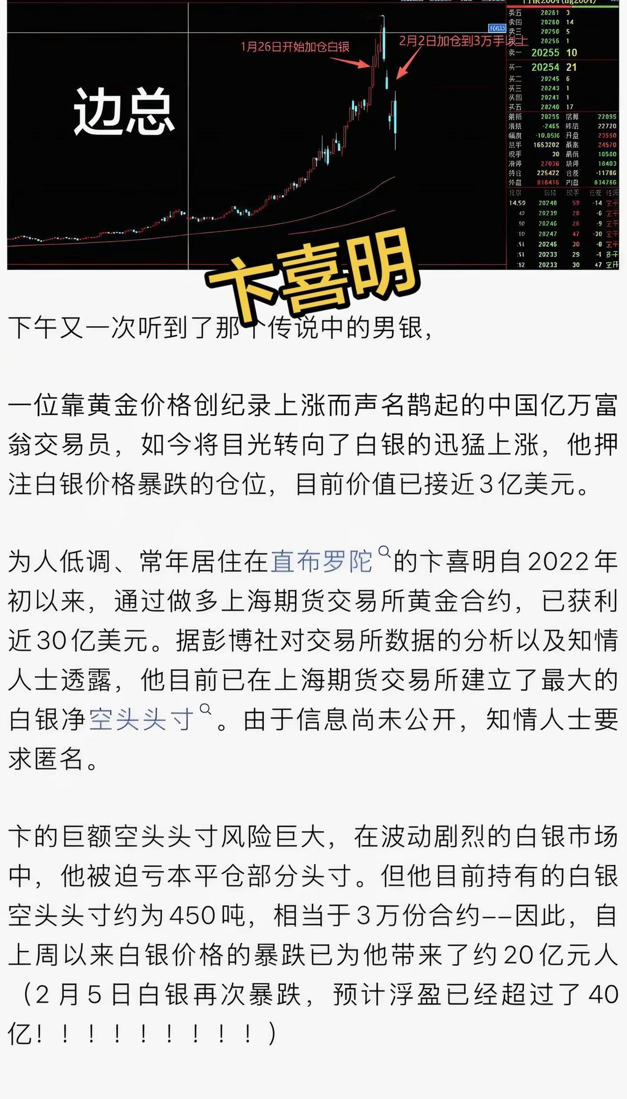 一位靠黄金价格创纪录上涨而声名鹊起的中国亿万富翁交易员,如今将目光转向了白银的迅猛上涨,他押注白银价格暴跌的仓位,目前价值已接近3亿美元。为人低调、常年居住在直布罗陀°的卞喜明自2022年初以来,通过做多上海期货交易所黄金合约,已获利近30亿美元。据彭博社对交易所数据的分析以及知情人士透露,他目前已在上海期货交易所建立了最大的白银净空头头寸“。由于信息尚未公开,知情人士要求匿名。卞的巨额空头头寸风险巨大,在波动剧烈的白银市场中,他被迫亏本平仓部分头寸。但他目前持有的白银空头头寸约为450吨,相当于3万份合约--因此,自上周以来白银价格的暴跌已为他带来了约20亿元的盈利。
