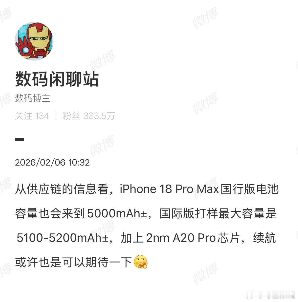 iPhone18ProMax或是续航最强苹果机数码闲聊站爆料iPhone18 Pro Max国行电池有望突破5000mAh。上一代17 Pro Max国行是4823mAh。确实有所提升,苹果在电池上就不能多挤点牙膏吗