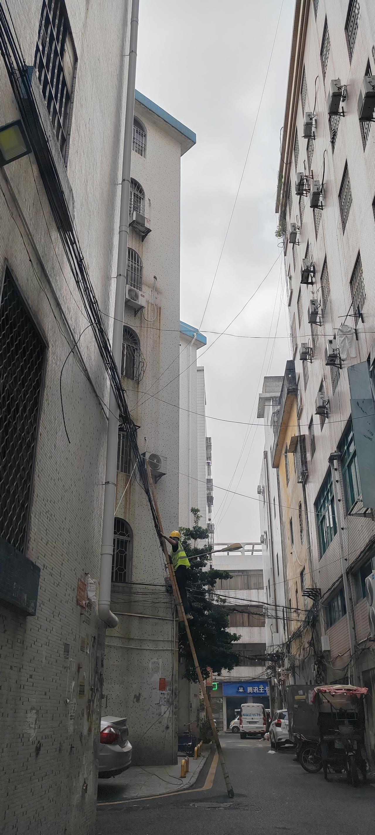 刚刚经过顺德容桂一条巷子,看到一个基层工作人员,用梯子架着电线上在整理电线,有可