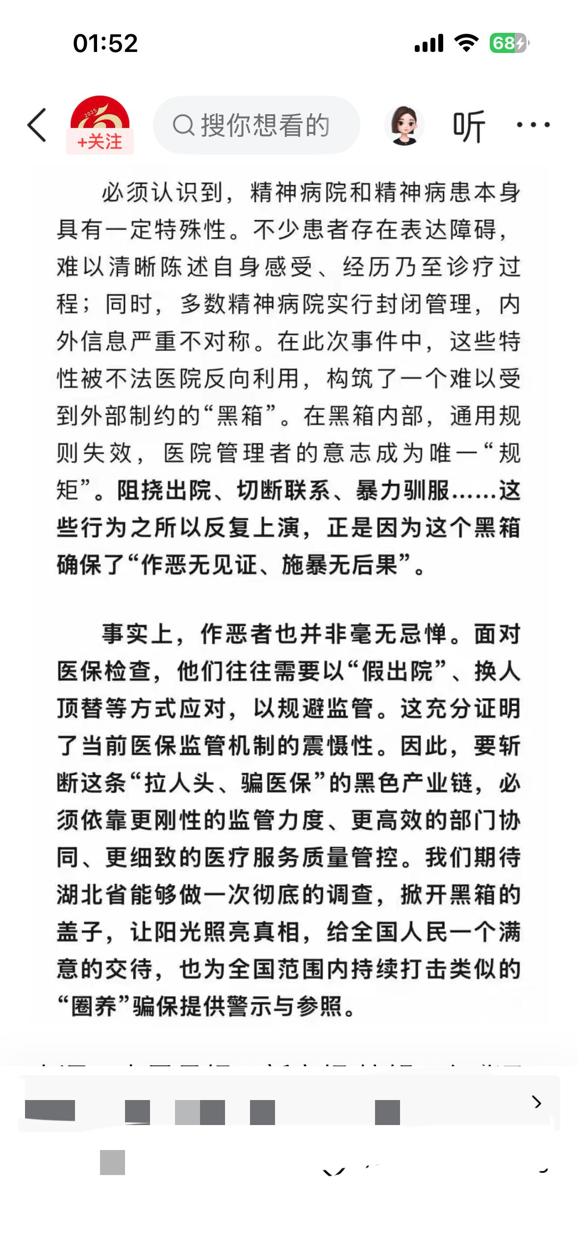 人民日报发表了关于湖北襄阳精神病院的事情评论。 撰稿人表示医保的制度还是有震慑力有约束力的,精神病院需要不停地折腾病人出院,住院,顶替人员,规避监管,没有办法顺畅地骗取他医保。充分地体现了当前现有监管机制对违法行为形成有效的震慑力。 最主要是要查清黑色产业链,给人民群众一个交代。