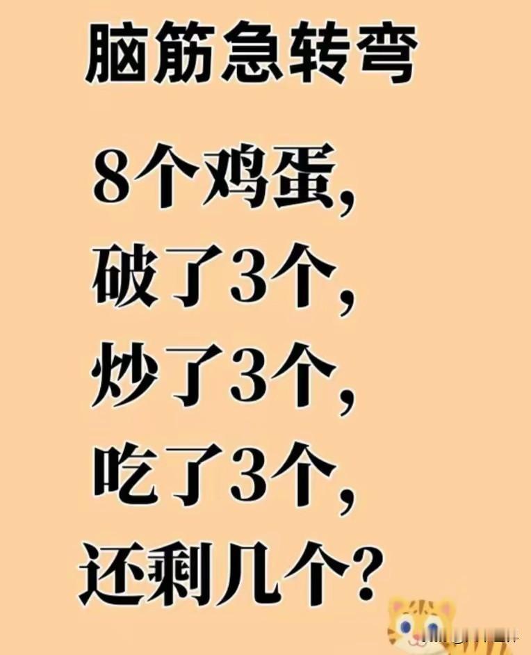脑筋急转弯,据说100个人,只有一个人能算出答案!请问:8个鸡蛋,破了3个,炒了3个,吃了3个,还剩几个? 很多人第一反应直接减法,8减3减3减3,算出负数就懵了,这恰恰是掉进了惯性思维的坑。 各位看官你们能算出答案吗?欢迎在评论区留言讨论!