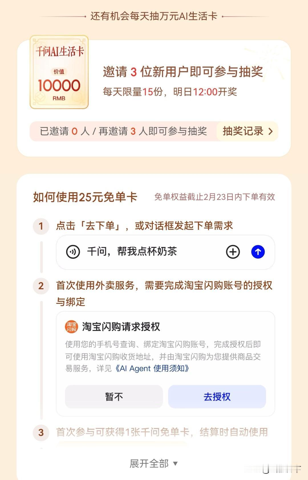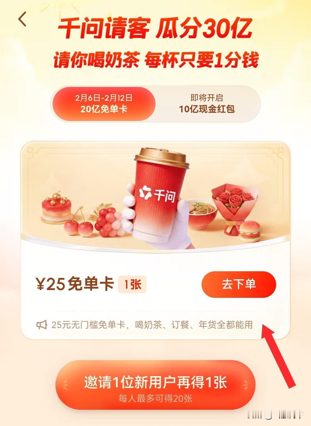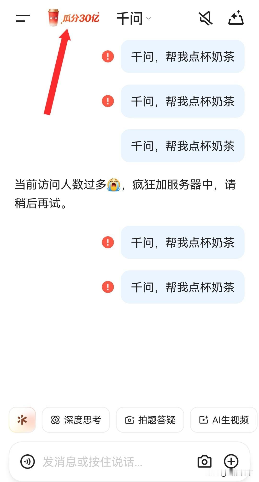 到底谁喝上了千问送的奶茶,4小时200万单,不仅把服务器都干崩了,奶茶店也干崩了,我这边一直点不上,显示当前访问人数过多,疯狂加服务器中,请稍后再试[捂脸][捂脸] 还不知道怎么操作的朋友看过来,先在手机应用市场下载千问APP,注册好账号,点击顶端瓜分30亿那里,然后点击去下单,这个是要绑定支付宝的,授权成功后就可以一分钱喝奶茶了。 你还可以邀请新用户参加,这样自己也可以得免单卡,每人最多20张,还可以点奶茶和其他美食,这不妥妥打工人福音嘛,赶紧动起手来吧[呲牙][呲牙]