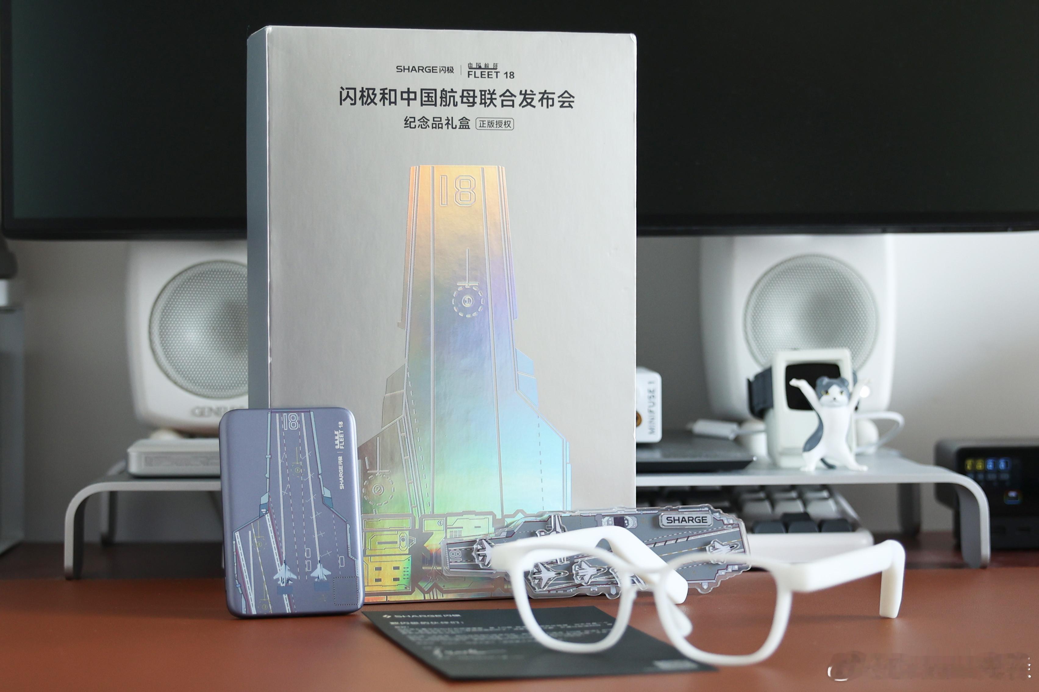 开箱闪极纪念礼盒,首先今年他们有新的AI眼镜,先给了3D打印眼镜框试戴。另外有一款闪极福建舰联名充电宝,5000mAh,113g重量,厚度0.87cm,15W无线快充,在这个市场很卷的产品。