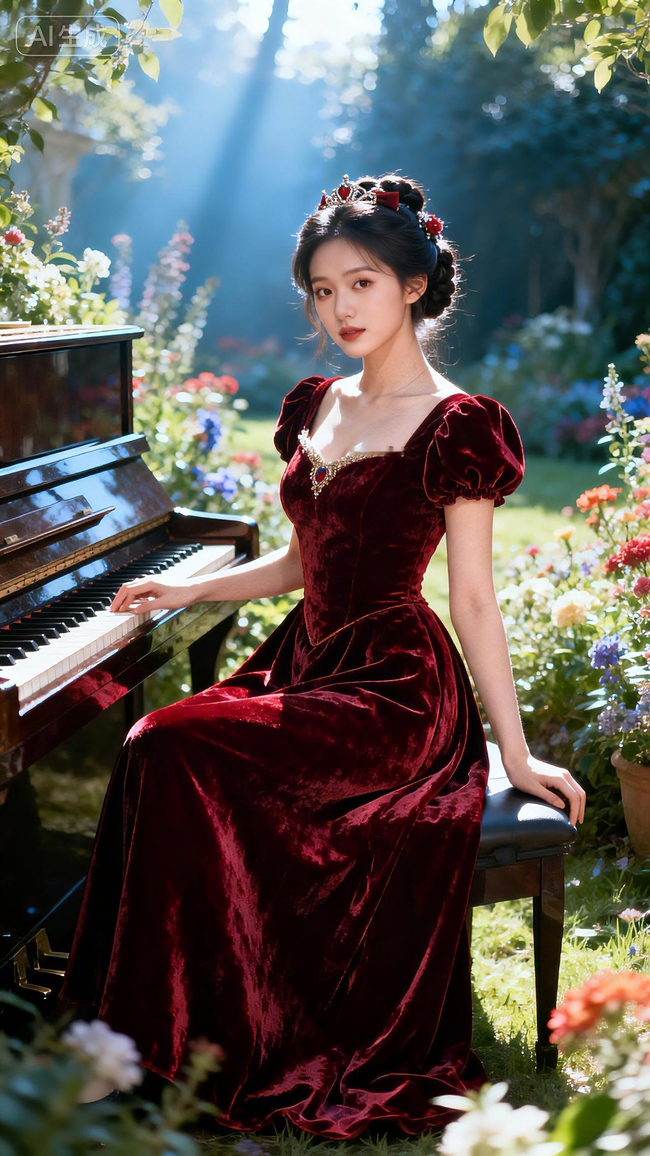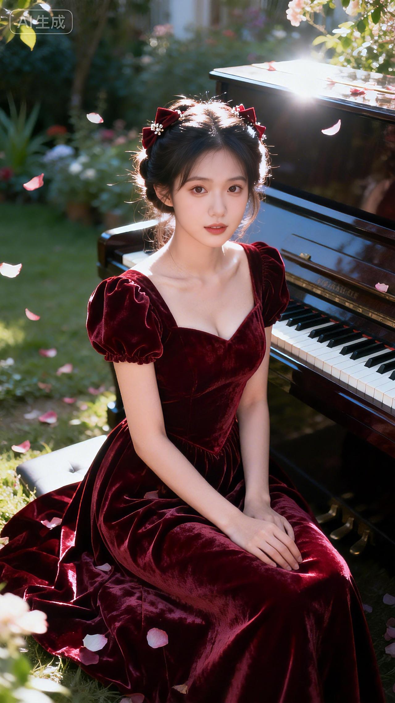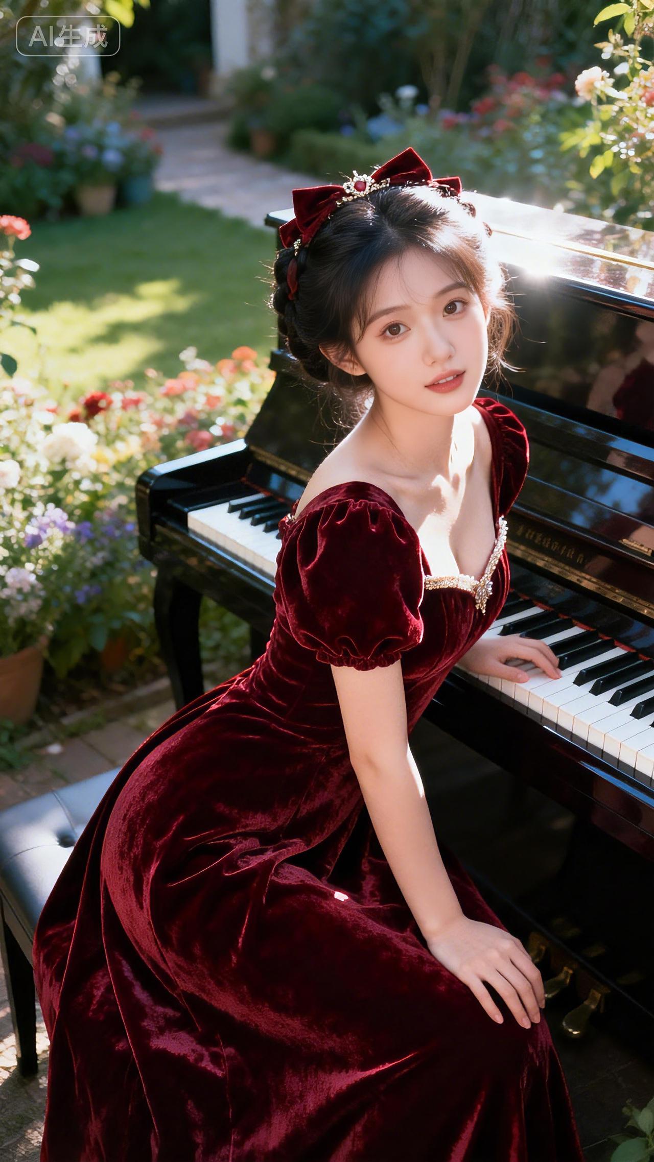天鹅绒暖映琴光,酒红裙曳暗生香。豆包 壁纸 写真