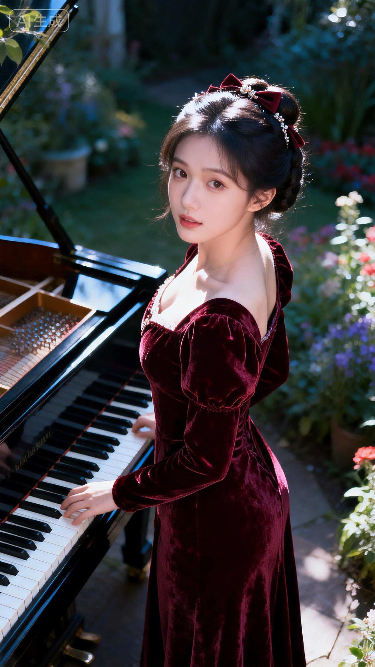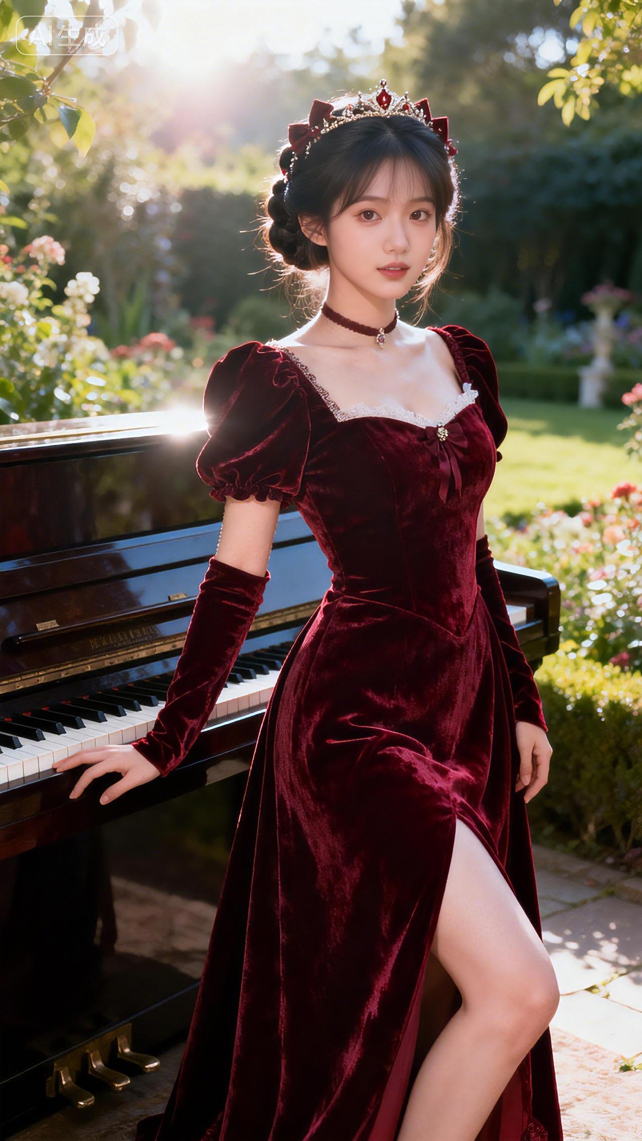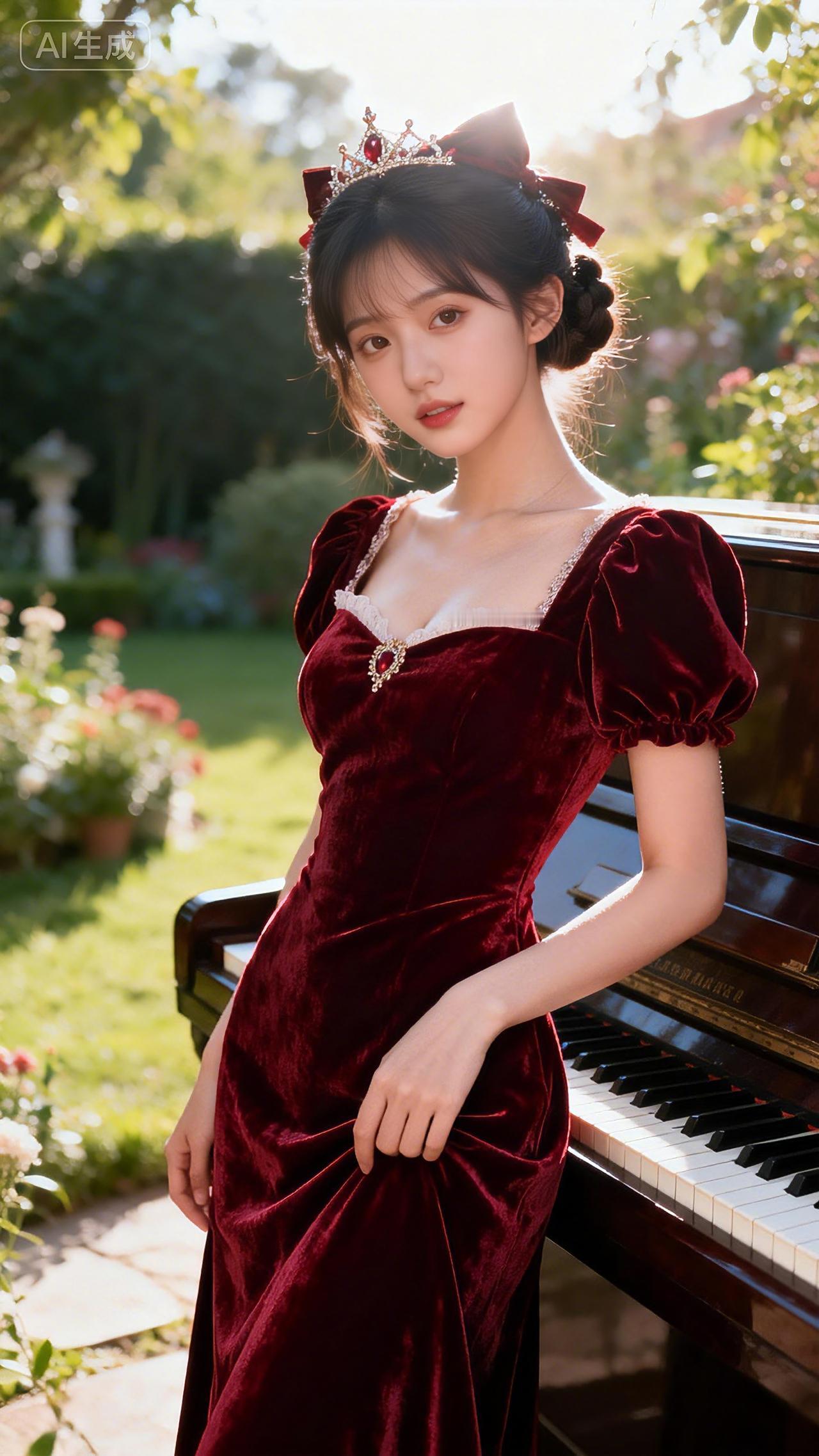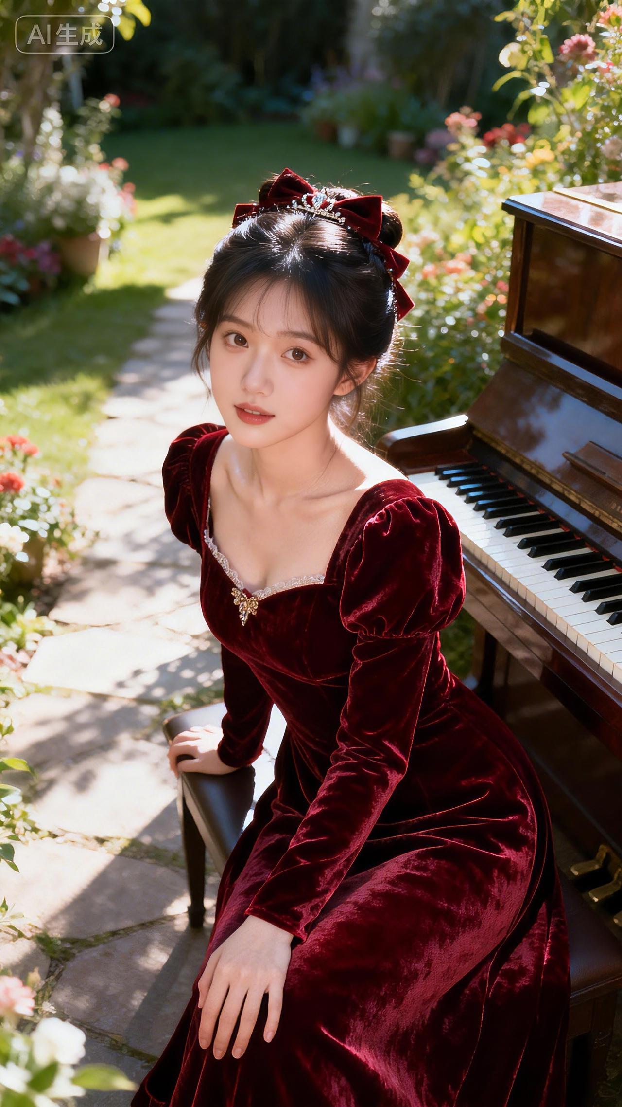 天鹅绒暖映琴光,酒红裙曳暗生香。豆包 壁纸 写真