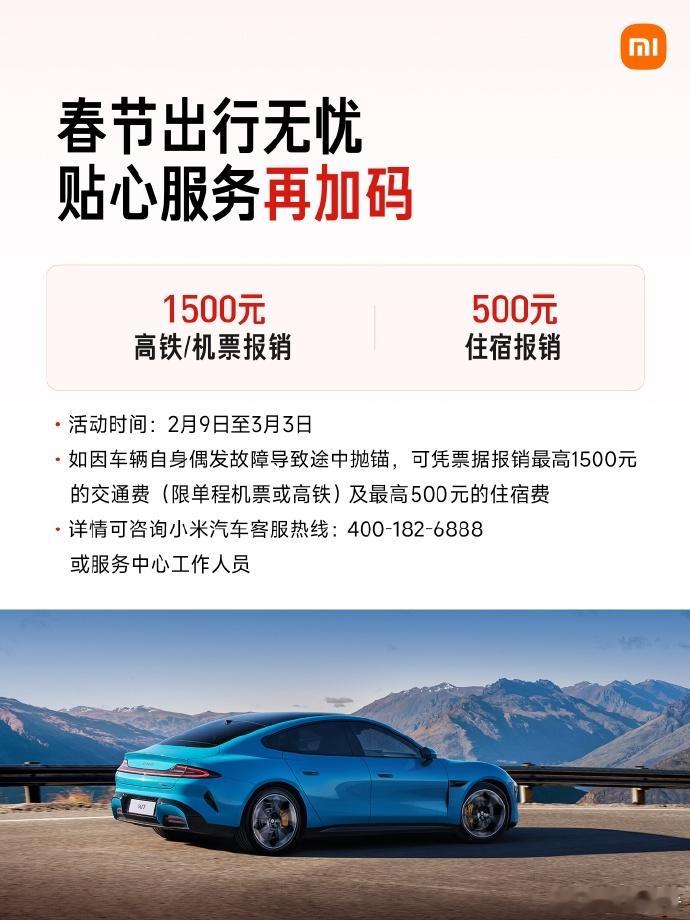 其三,车辆自身故障致抛锚,最高报销1500元交通及500元住宿费用。汽场全开小米汽车春节服务不打烊小米汽车