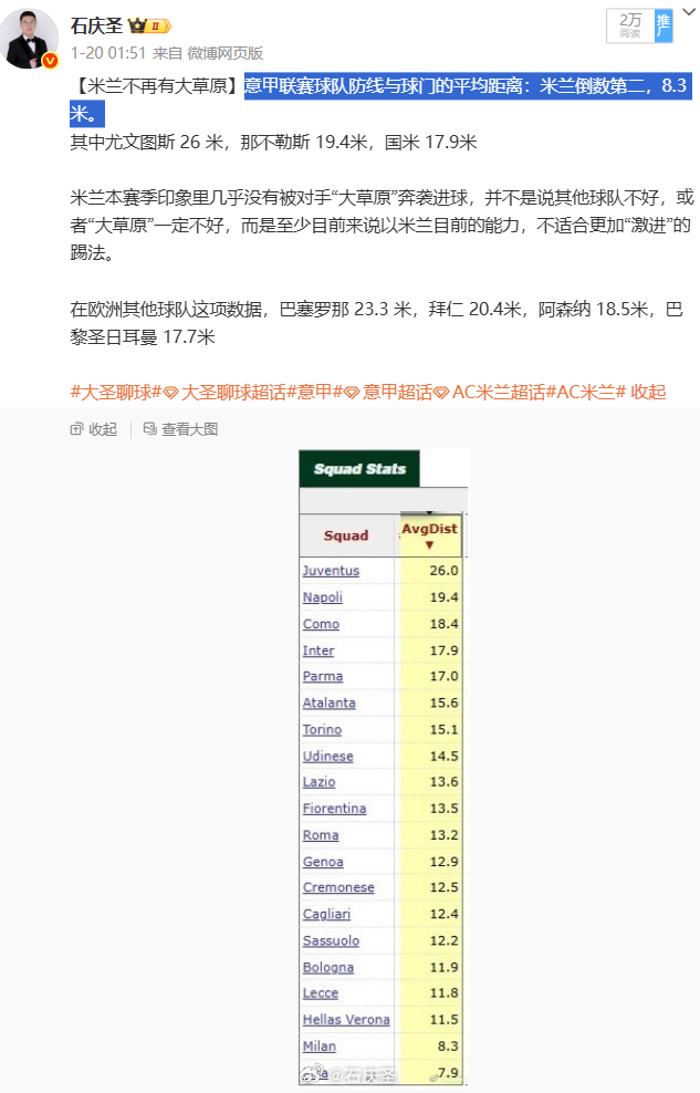再加上之前的数据,米兰是意甲防线与球门的平均距离倒数第二的球队,8.3米。