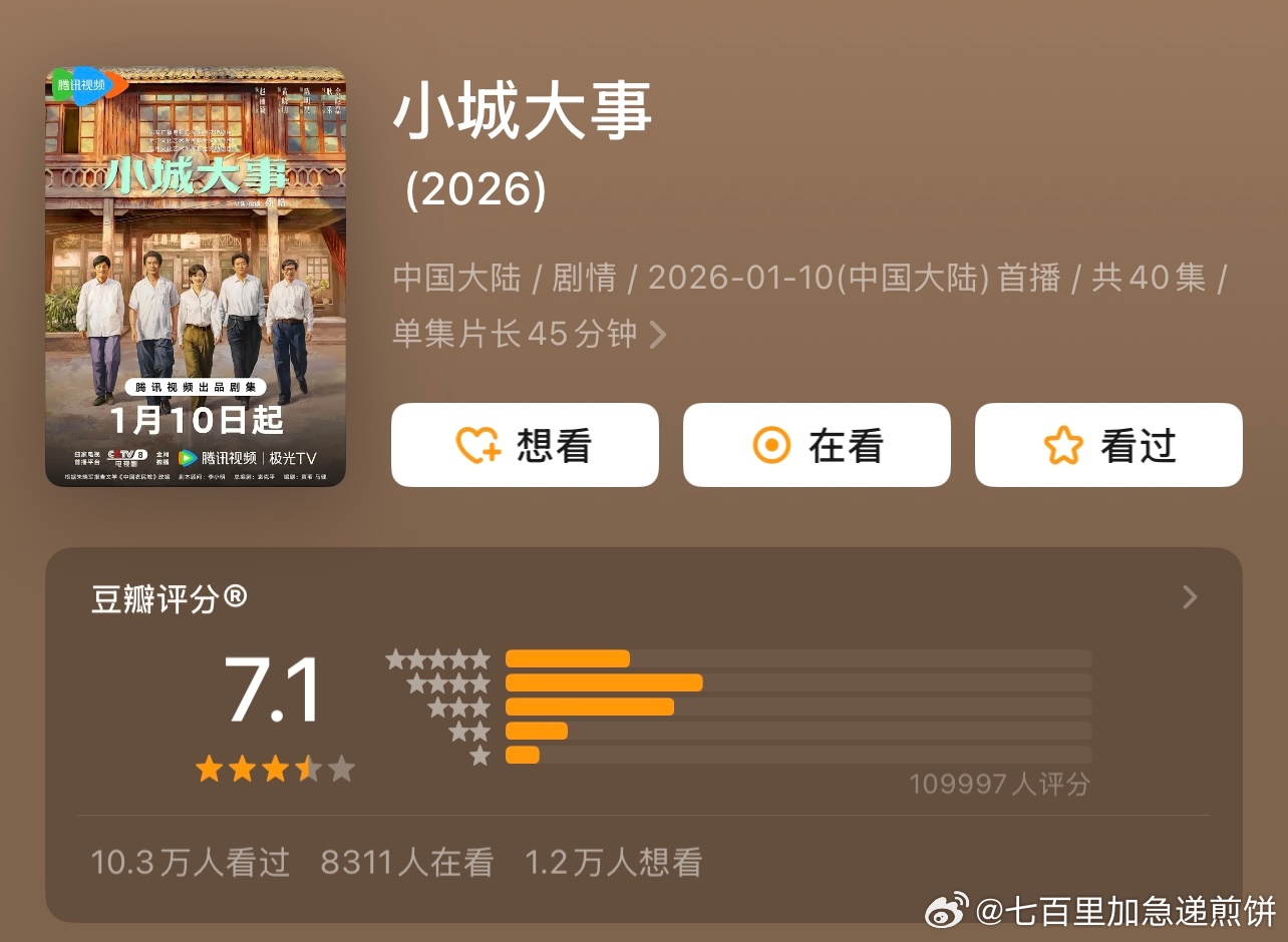 赵丽颖、黄晓明《小城大事》开分7.1,11w人打分