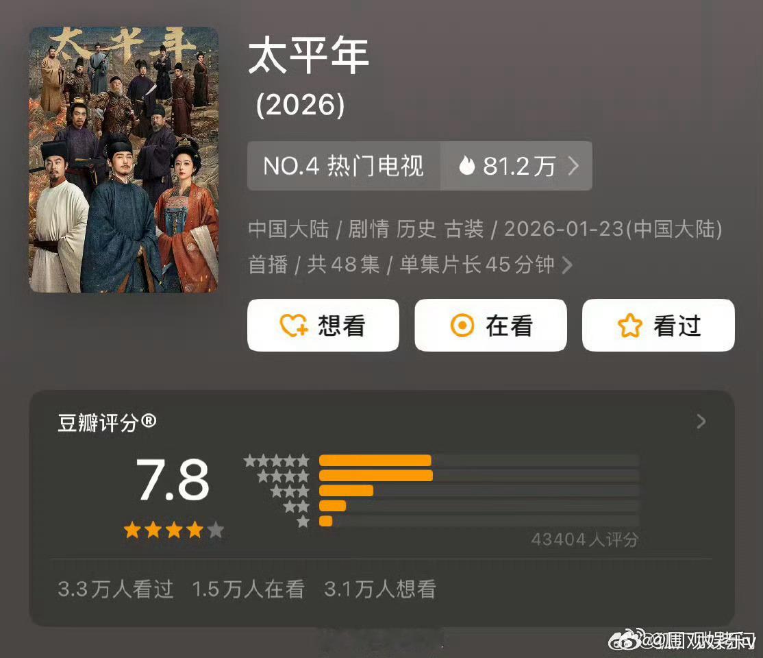 白宇周雨彤新剧豆瓣开分7.8周雨彤太平年豆瓣开分7.8白宇周雨彤新剧太平年豆瓣