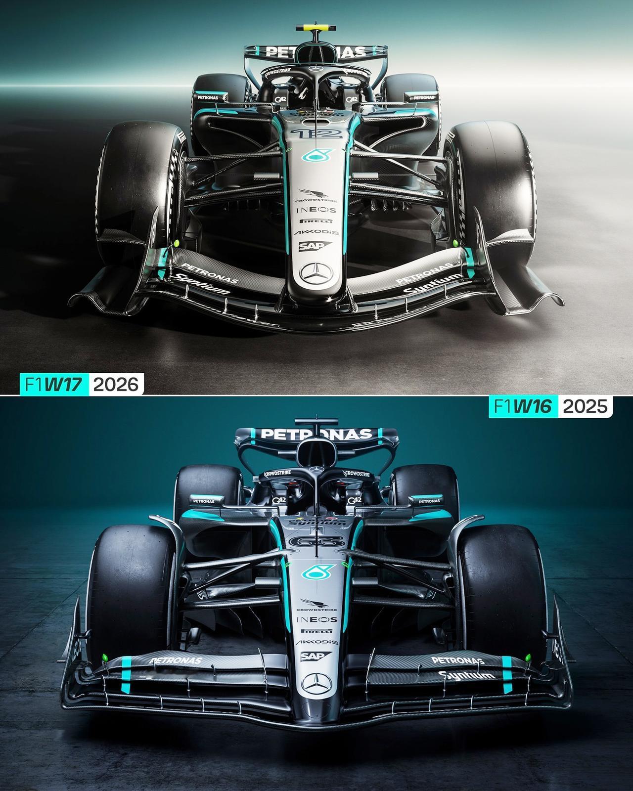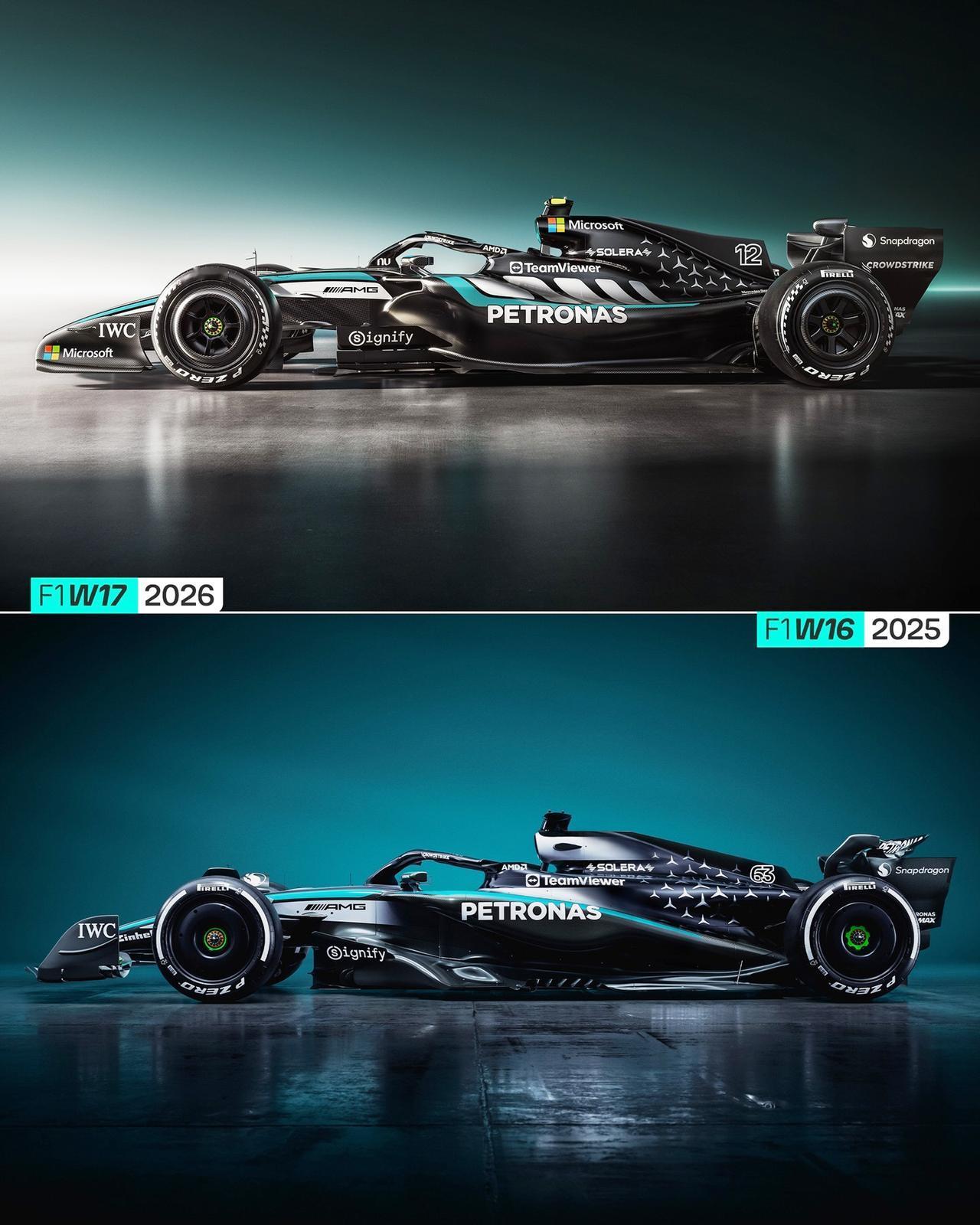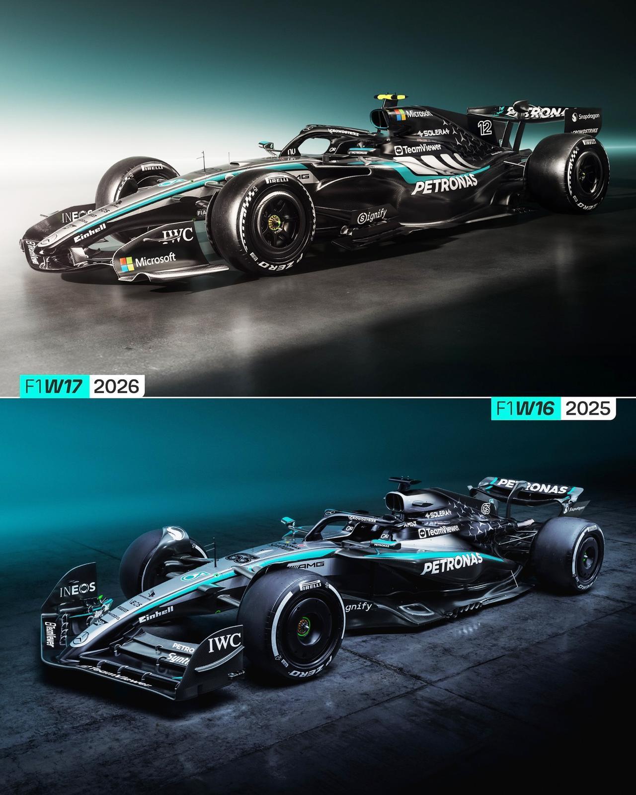 梅赛德斯-AMG F1车队新赛季赛车W17 梅赛德斯-AMG F1车队已经揭晓了新赛季赛车梅赛德斯-AMG F1 W17 E PERFORMANCE,我们来看一下。 他的外观W17采用全新涂装设计,动态的佩特罗纳斯绿色流线贯穿车身,引领了梅赛德斯标志银色到车队专属深黑色的过渡,侧箱顶部饰有AMG特有的菱形图案,发动机盖上仍是梅赛德斯标志性的三叉星。 为了符合新赛季的规则赛车采用了全新的底盘和动力单元。其发动机采用电能与内燃能相结合的驱动方式,其中电能与内燃能的比例接近50:50。 W17比其前代产品更小、更窄、也更轻。该赛车配备了主动空气动力学系统,前后翼均可移动。 2026年一级方程式将发生重大变革,因此所有车队赛车都要重新研发,显然梅赛德斯-AMG F1车队已经做好准备,在巴塞罗那试航周上,W17表现出色。 新赛季的梅奔车队的核心阵容没有变化,车手是乔治·拉塞尔与基米·安东内利;车队负责人兼首席执行官仍是托托·沃尔夫。