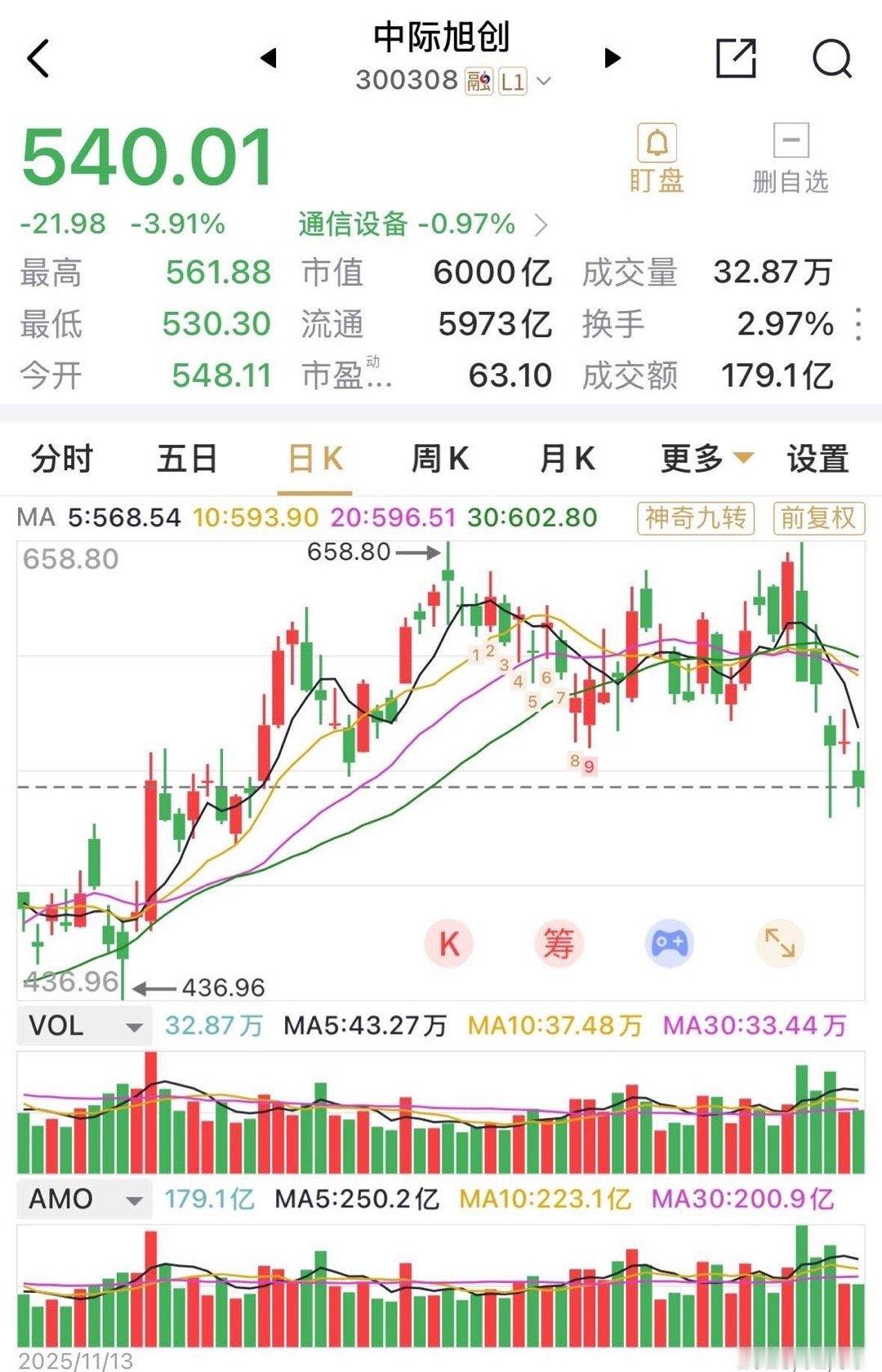 中际旭创短短几个交易日跌没了1200亿元的市值。2月已累跌近17%,月线9连阳的强势拉升后,估计只会剩“一地基谋”。中际旭创净利润翻倍增长的利好消息恰好是兑现的信号而已。涨多了(近6倍)回调要调多少好呢,个人认为涨幅2/3的位置能止跌己算强势个股。