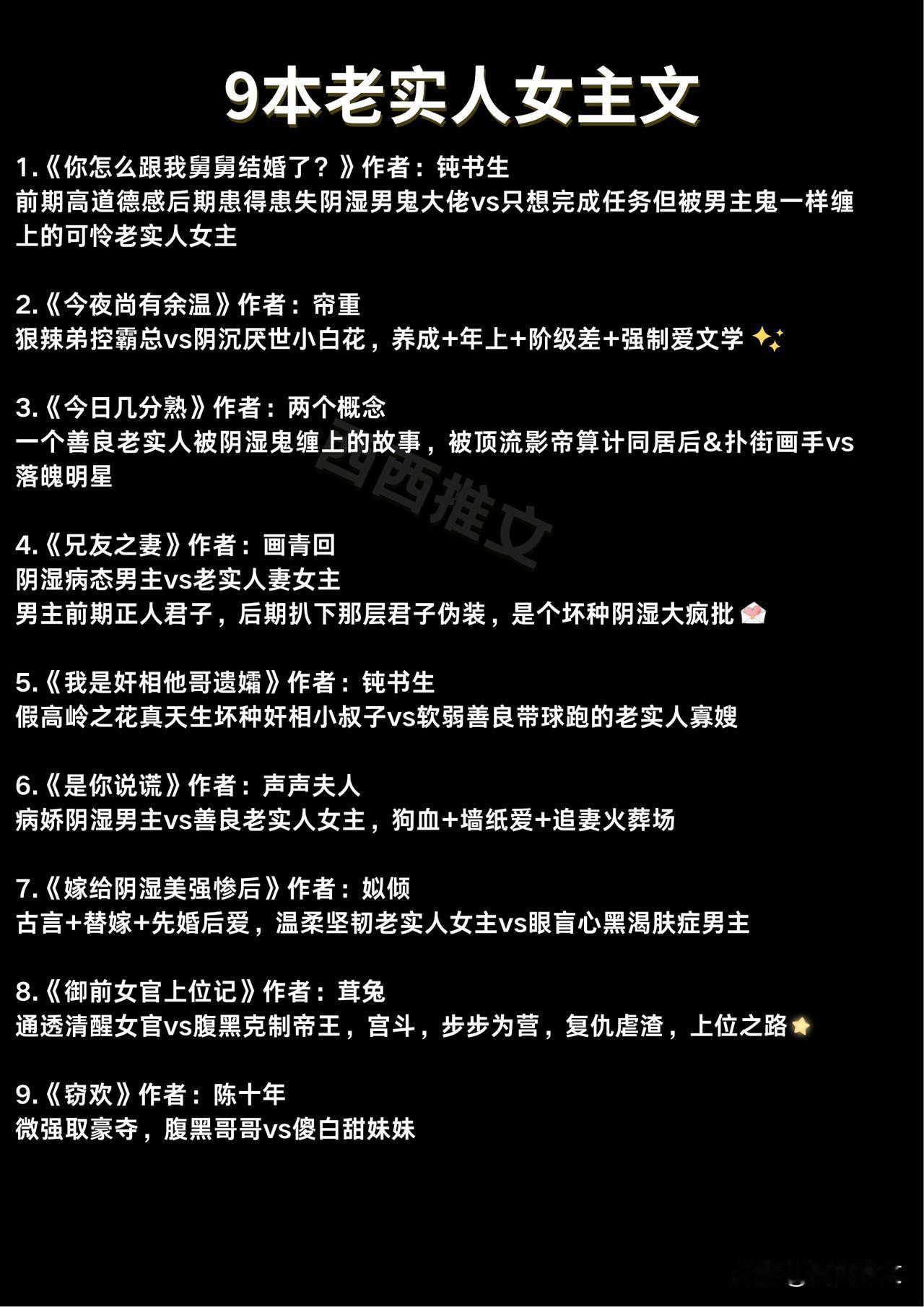 9本老实人女主文 1.《你怎么跟我舅舅结婚了?》作者:钝书生 前期高道德感后期患得患失阴湿男鬼大佬vs只想完成任务但被男主鬼一样缠上的可怜老实人女主 2.《今夜尚有余温》作者:帘重 狠辣弟控霸总vs阴沉厌世小白花,养成+年上+阶级差+强制爱文学 3.《今日几分熟》作者:两个概念 一个善良老实人被阴湿鬼缠上的故事,被顶流影帝算计同居后&扑街画手vs落魄明星 4.《兄友之妻》作者:画青回 阴湿病态男主vs老实人妻女主 男主前期正人君子,后期扒下那层君子伪装,是个坏种阴湿大疯批 5.《我是奸相他哥遗孀》作者:钝书生 假高岭之花真天生坏种奸相小叔子vs软弱善良带球跑的老实人寡嫂 6.《是你说谎》作者:声声夫人 病娇阴湿男主vs善良老实人女主,狗血+墙纸爱+追妻火葬场 7.《嫁给阴湿美强惨后》作者:姒倾 古言+替嫁+先婚后爱,温柔坚韧老实人女主vs眼盲心黑渴肤症男主 8.《御前女官上位记》作者:茸兔 通透清醒女官vs腹黑克制帝王,宫斗,步步为营,复仇虐渣,上位之路 9.《窃欢》作者:陈十年 微强取豪夺,腹黑哥哥vs傻白甜妹妹9本老实人女主文