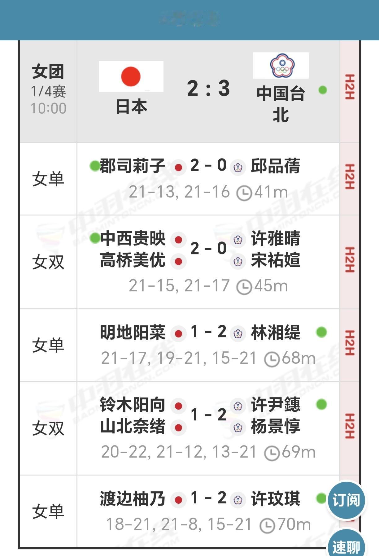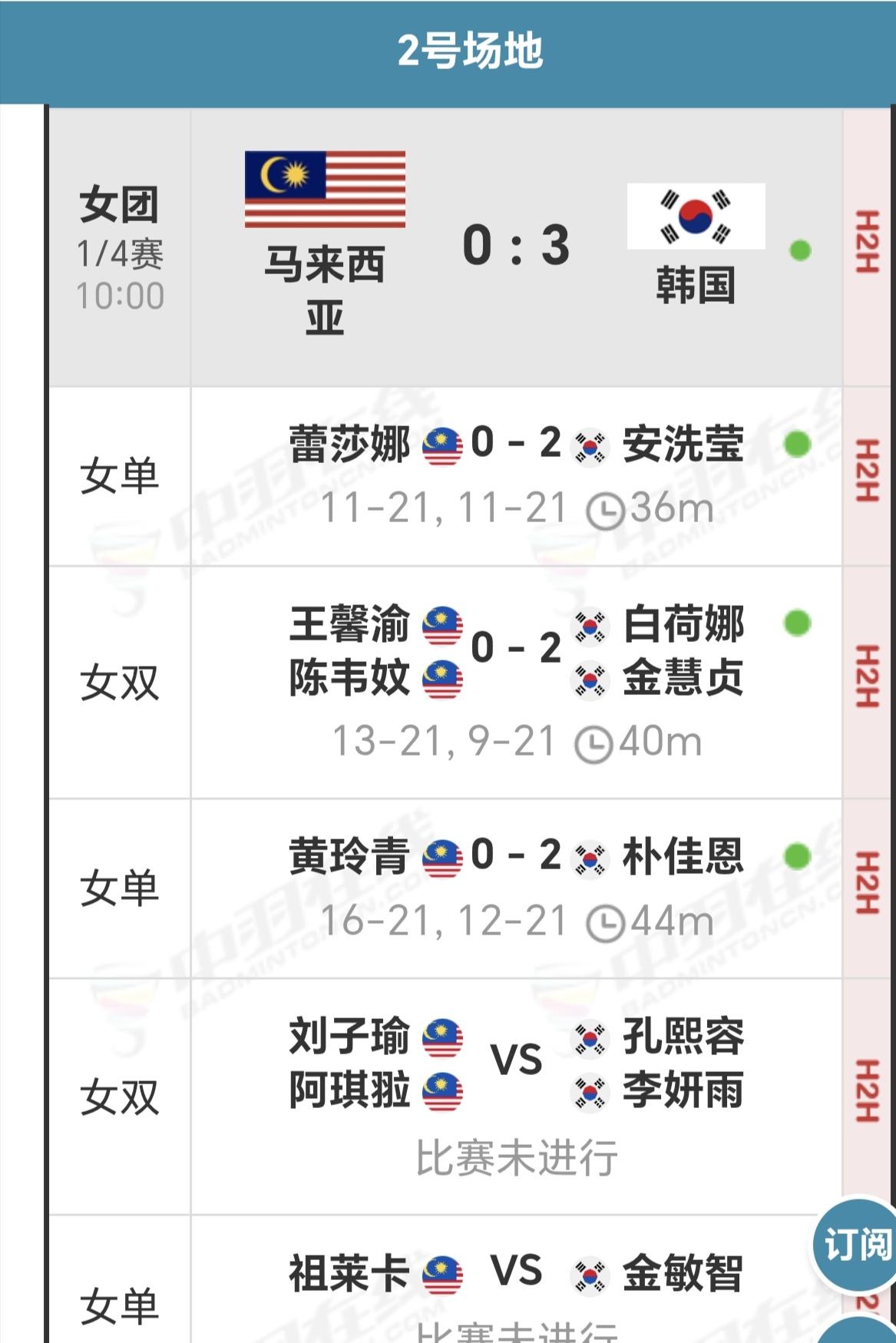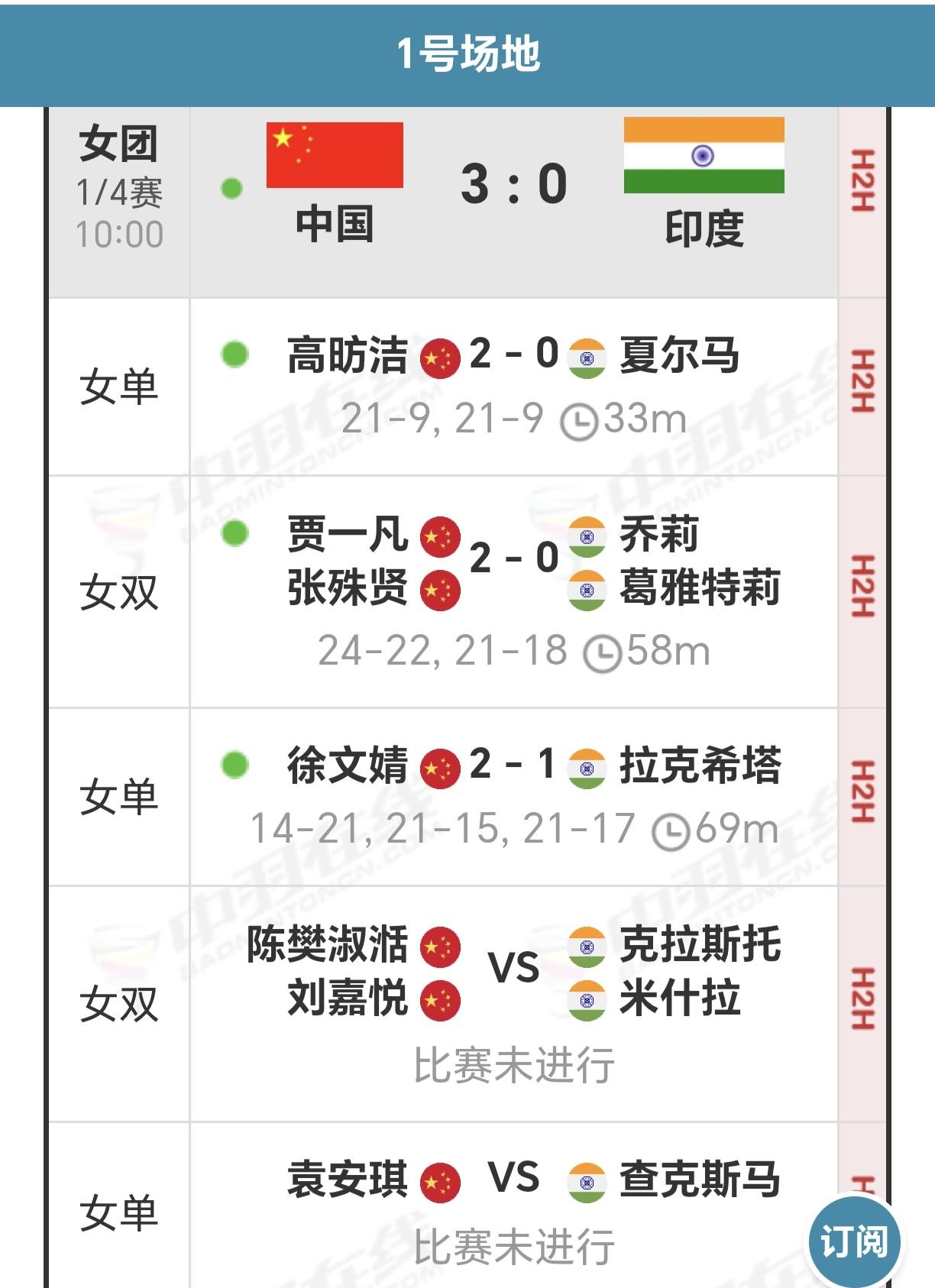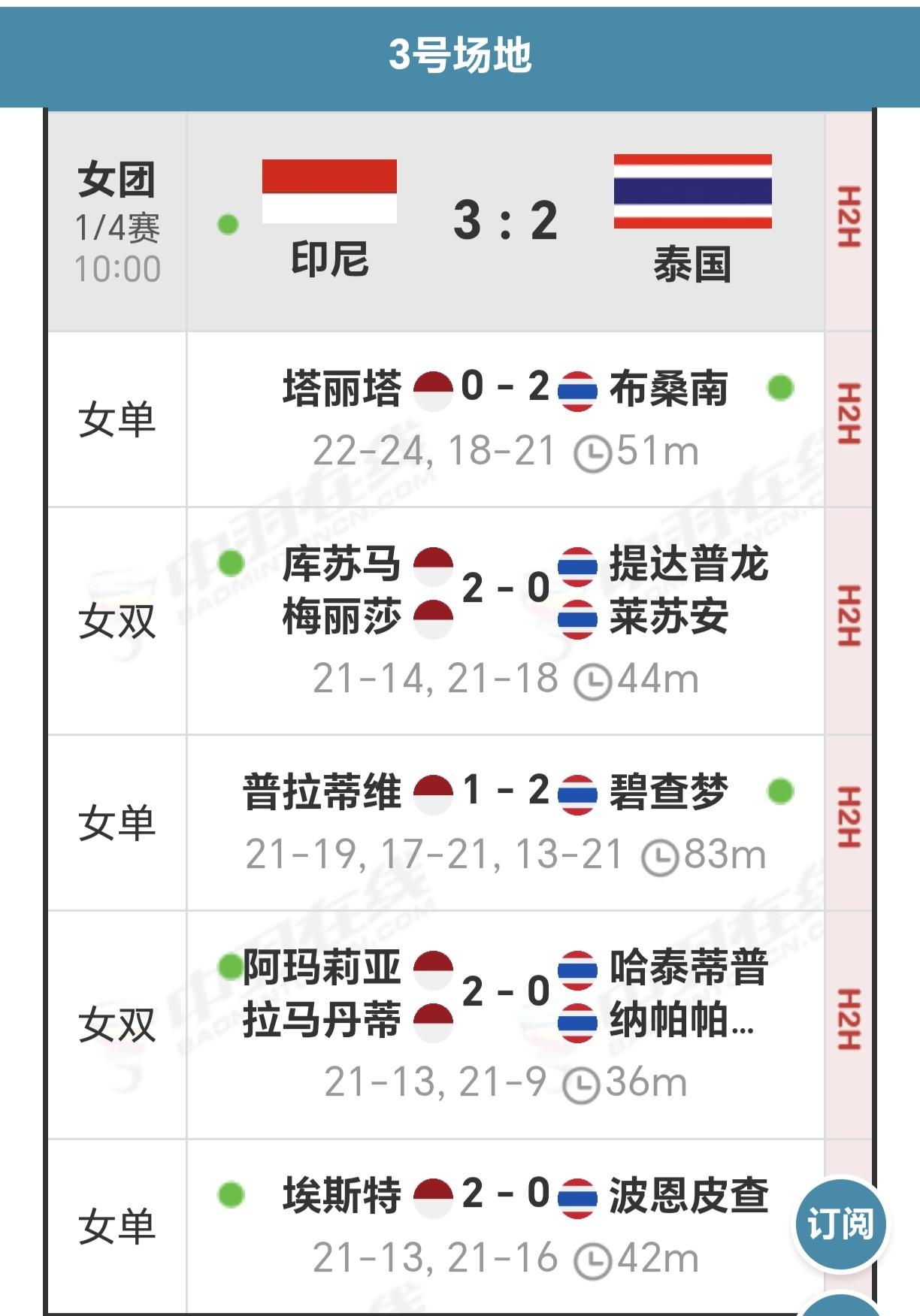 亚团赛女团四强出炉 女团八强战经过精彩纷呈的比拼,最后决出女团四强。 首先是韩国队以3-0轻松横扫马来西亚女团,率先晋级四强。 随后中国女团除高昉洁2-0轻松战胜夏尔马外,贾一凡/张殊贤虽是2-0击败对手乔莉/葛雅特莉,但赢得并不轻松,两局比分都是只差2-3分胜出,24-22,21-18。第三场二单徐文婧则是鏖战三局以2-1逆转战胜排名52位的拉克希塔,最后国羽女团以3-0淘汰印度女团,晋级四强。 再次是印尼女团经过5盘大战以3-2力克泰国女团晋级四强。 最后是中国台北女团同样是5盘鏖战,最后以3-2淘汰日本女团晋级。 从阵容来看,只有韩国女团是豪华阵容,全是国内顶级高手世界第一的安洗莹都亲自上场,其他队大多是年轻小将为主,各自的目标不一样,主要是锻炼队伍培养后备力量! 我们国羽女团就是以小将为主,参加大赛锤炼意志坚定信心,继续加油冲!