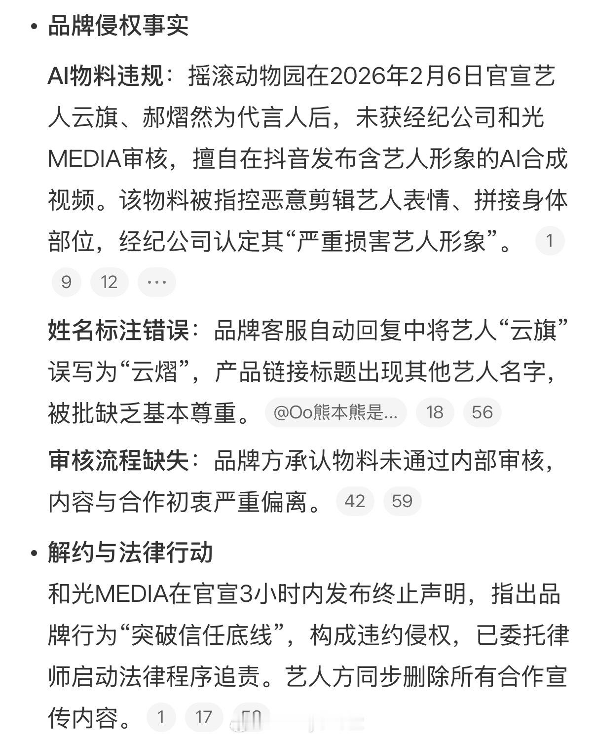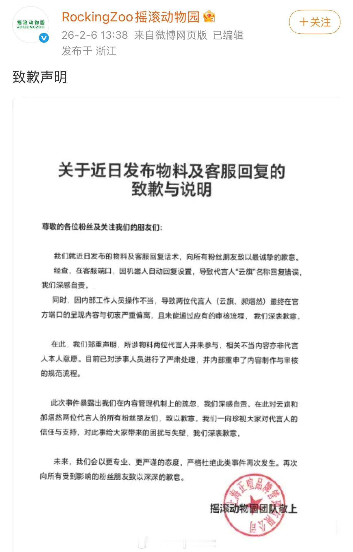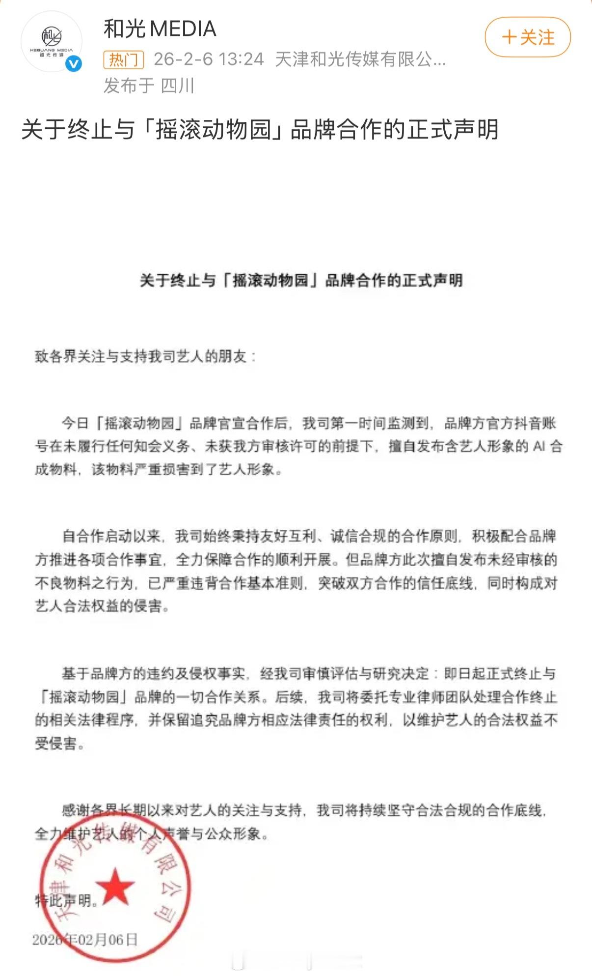摇滚动物园AI云旗、郝熠然上午十点官宣双人代言,下午一点半就解约,艺人公司称品牌