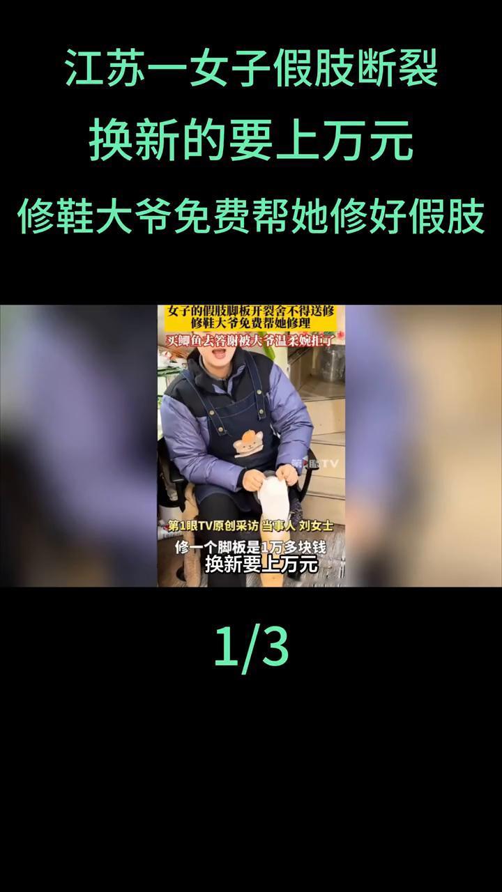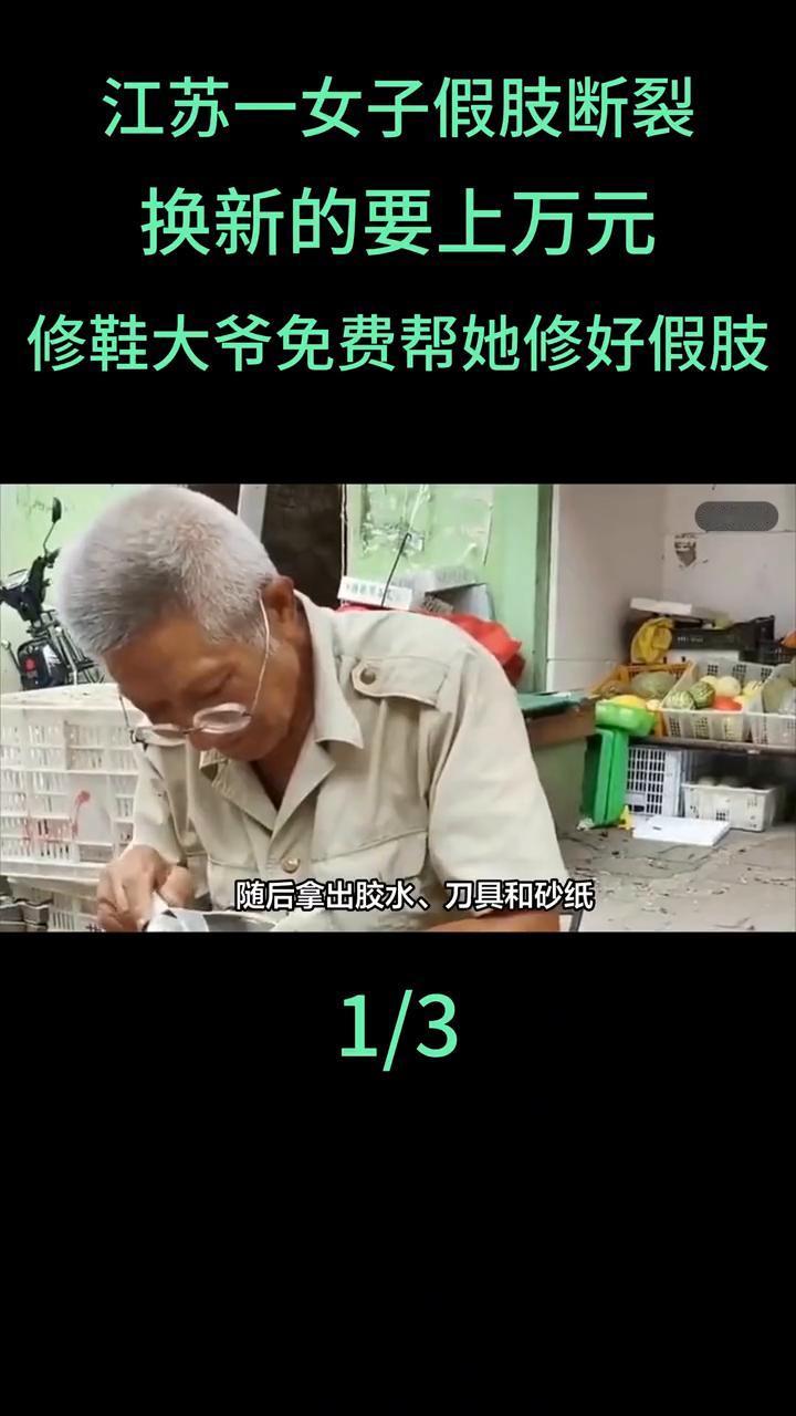 江苏一女子假肢断裂,换新的要上万元,修鞋大爷免费帮她修好假肢。 第1眼TV原创采访当事人刘女士。 女子的假肢脚极开裂舍不得送的,修鞋大爷免费帮她修理,买舞价去答附被大爷温柔婉推了。修一个脚板是1万多块钱。 近日,江苏无锡一位女子的义肢脚底突然断裂,换新要上万元。她一时犯了难,情急之下,她抱着试试看的心态,找到了街边一位修鞋大爷。 视频里,大爷接过义肢,坦诚的说:我从没修过这东西。可他没推辞,而是戴上老花镜,仔细观察结构。随后拿出胶水、刀具和砂纸,认真涂胶、裁剪、打磨。整个过程专注又细致,仿佛在修复一件精密仪器。最终,义肢不仅被修好,还比原来更结实。 当女子掏出钱感谢时,大爷连连摆手:不要钱,能帮上忙就行。这份朴实的善意,让无数人动容。