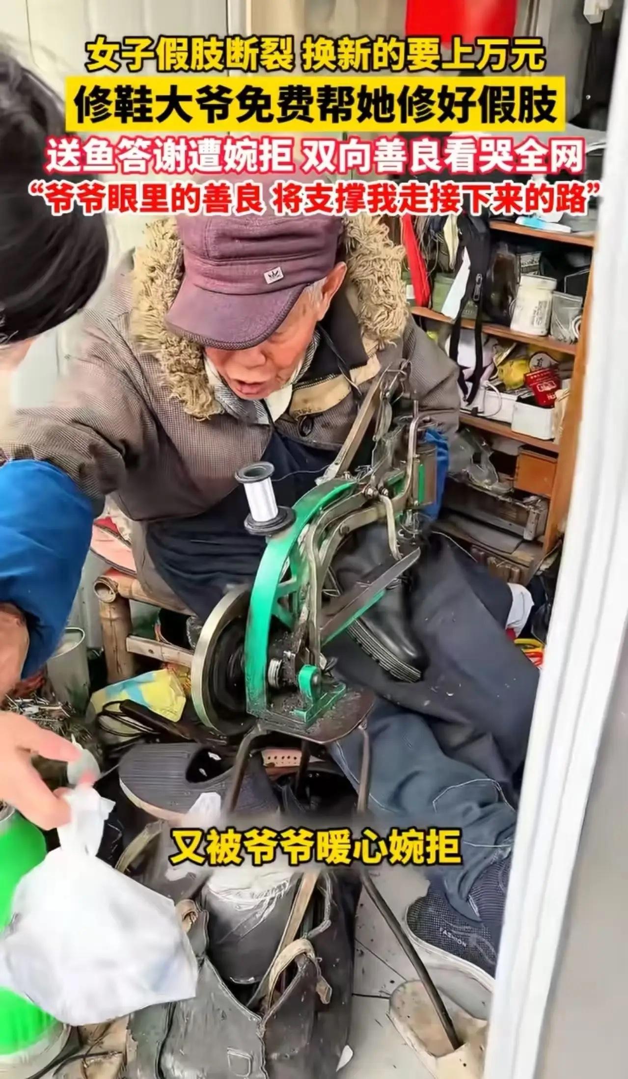 看哭了!江苏无锡,女子假肢断裂,医生说换新的上万元,女子没钱,就拿着假肢问修鞋大爷能不能修?修鞋大爷修了一辈子的鞋子,从来没修过假肢,但他看到女子这么可怜,还是帮女子修好了!可是女子问大爷多少钱,大爷居然说…… 大爷接过那只脚底板已经裂开的假肢,他实话实说,修了一辈子鞋,这东西还真是头一回碰上,他答应试试看。 女子实在掏不出来换新假肢的上万块钱,才抱着最后一丝希望来到修鞋摊。大爷找来耐磨的胶皮,一针一线仔细缝补,又涂上胶水加固,他不仅把断裂处修好,还特意钉上了一块防滑垫,想让女子走路更稳当。 修理完毕女子试了试,假肢变得结实又合脚。她赶忙掏钱,大爷却连连摆手:“这又不是修鞋,就是顺手帮个忙,收什么钱。” 女子过意不去,转身去市场买了条鲫鱼要送给大爷,大爷却不肯收,把鱼推了回去,只朴实地说:“听我的。” 一个多世纪前的英国有位修鞋匠詹姆斯·吉灵厄姆,他也是用做鞋的手艺,为一名失去手臂的男子制作了皮革假肢,后来还帮助了上万名残疾人。跨越百年,不同国度的修鞋匠,都选择了用善良支撑他人的脚步。 女子后来说大爷修的假肢特别牢固,她走路踏实多了。她感激的不仅是省下了万元花费,更是这份不求回报的善意。 修鞋大爷的摊子不大,收入微薄,但他看到了别人的难处,这种朴素的善良,比任何华丽的语言都更有力量。真正的关怀往往藏在不经意的举手之劳上。 各位读者你们怎么看?欢迎在评论区讨论。