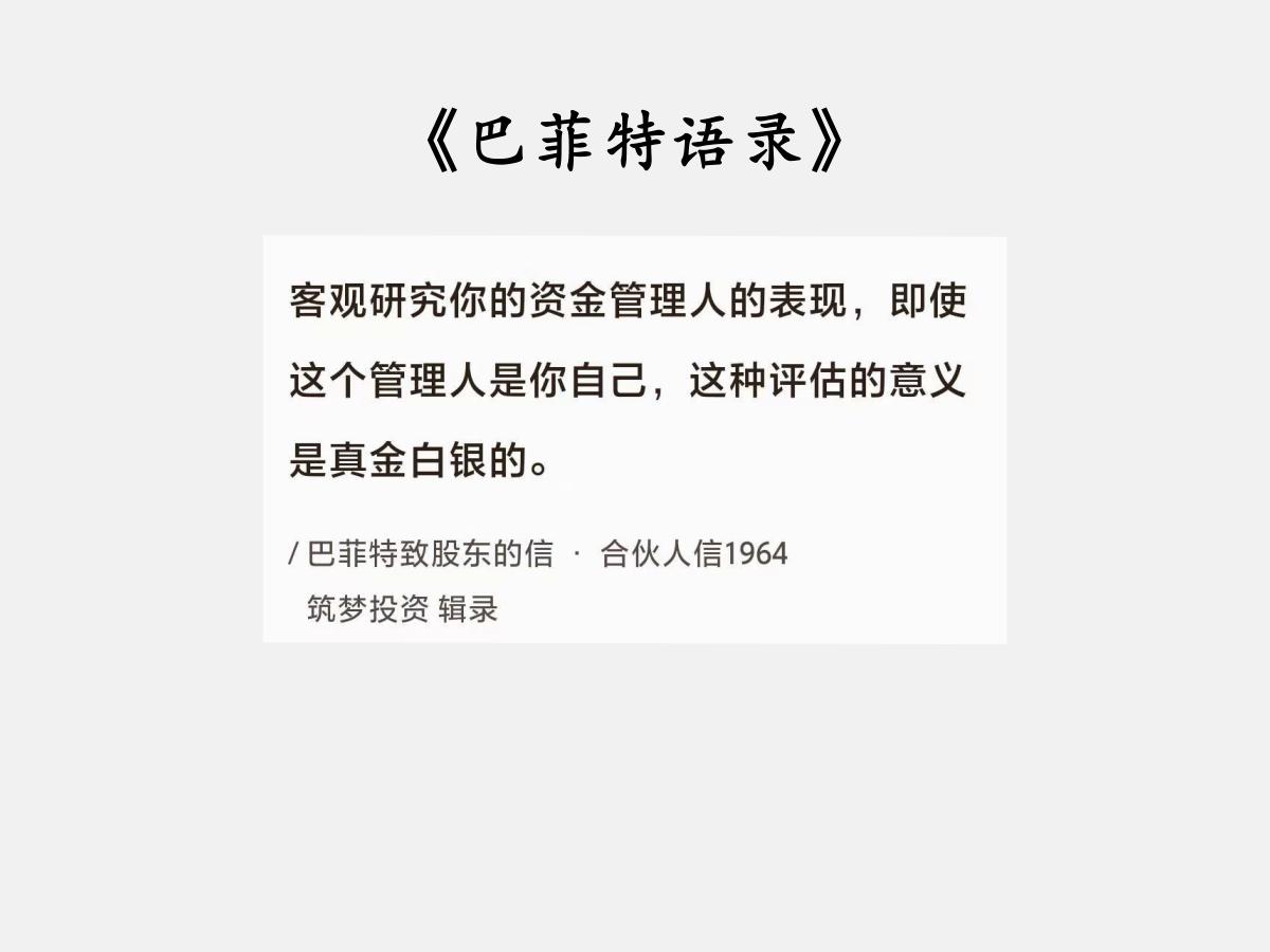 No150 股神巴菲特谈“真金白银的评估” 巴菲特曰:“客观研究你的资金管理人的表现,即使这个管理人是你自己,这种评估的意义是真金白银的。” 当我们去研究基金表现或他人业绩时,事不关己,是亏是赚都与自己不相干,所以可以高高挂起。 就像在谈论他人是非功过时,聊的是他人的事儿,尽可以大谈特谈,张口就来一样。 但如果研究的是自己管理的账户,或者所买基金,其基金经理、信托经理的表现,那就攸关切身利益,是在用真金白银去评估。 是亏是赚都是自个儿的,值得十分关切和认真评估。 实际上,研究他人业绩或基金表现依然很有意义。与之对照,可补足短板,可开拓新的投资思路。见贤思齐,见不贤思不齐。 就像巴菲特把道指和四只大型基金作为参照对象一样,能跑赢它们,他就会继续管理合伙基金;跑不赢,他就清盘,把钱还给基金合伙人。 同理,在对照后,如果我们跑不赢市场上的主流宽基指数,比如沪深300指数、上证50指数、中证500指数等,那还不如直接长期定投指数基金。