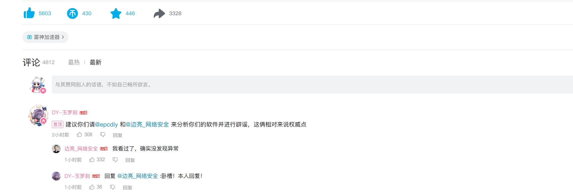 雷神的负责人加我好好聊了聊那个加速器读写量大的事,我其实发出来也是困惑为什么加速器会有读盘的操作,让大家警惕一下,但解释过后发现应该单纯是架构和软件兼容性问题,有安全工程师看过了说没事,那应该没事,有雷神的可以放心继续用了