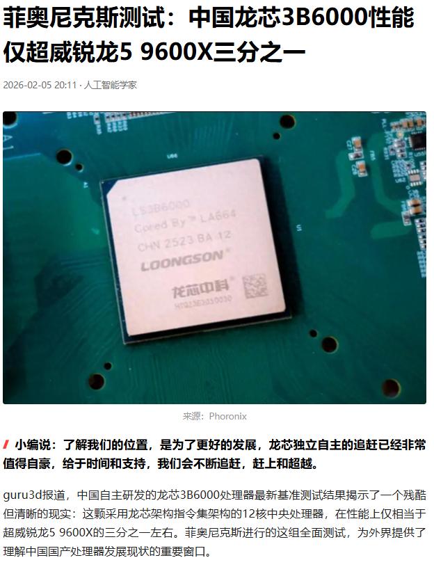 不吹不黑,龙芯作为纯国产芯片,这个龙芯3B6000处理器,虽然对标主流桌面处理器水平还是有差距,性能仅为锐龙5的三成。 但是要说的是,国产芯片性能差这不是单一问题,而是微架构、制程工艺、软件生态等多方面的代际差距。但是龙芯已经采用完全自研的LoongArch架构,从指令集到软件生态摆脱 x86/ARM 依赖,核心元器件国产化率100%。 已经突破了0,那100也就不远了。 虽然现在国产崛起很快,但是在芯片这边,前路还有很多荆棘要走,正视差距才能不断追赶超越。