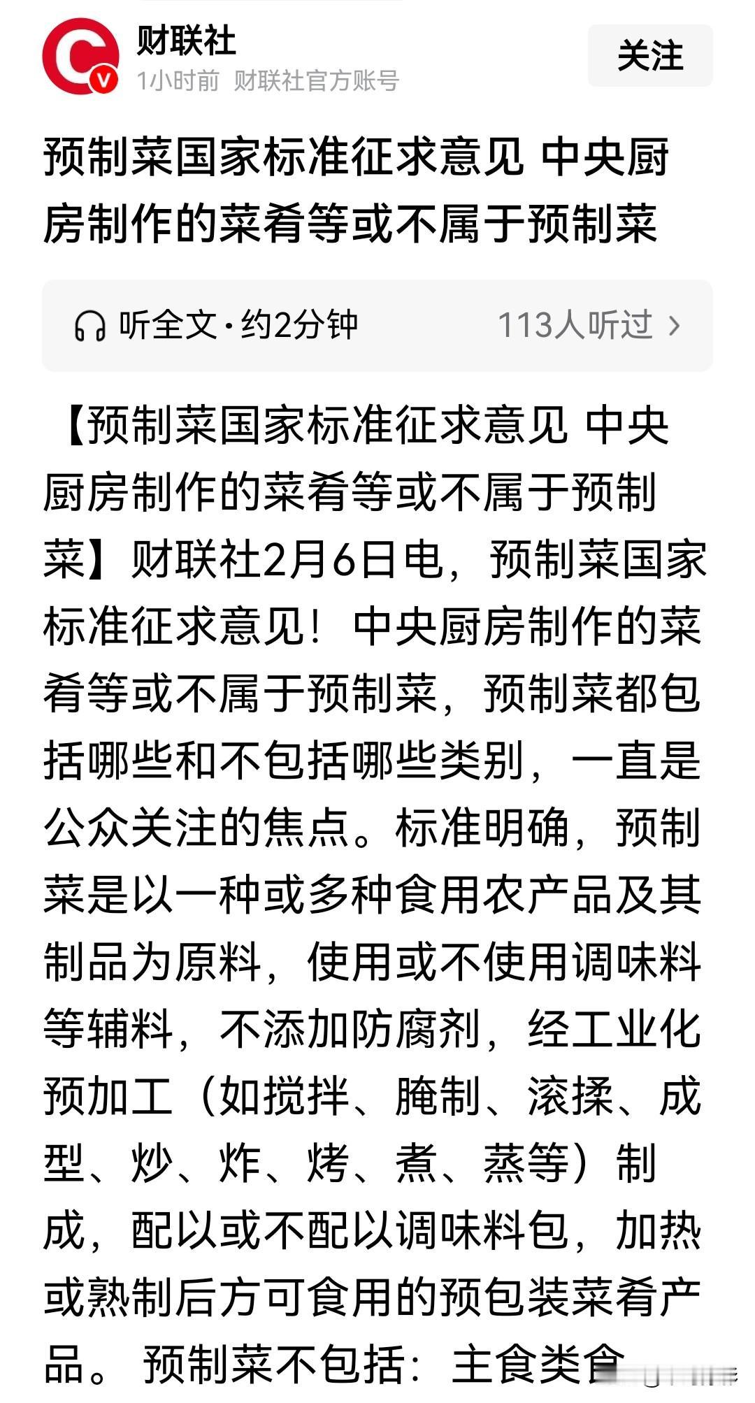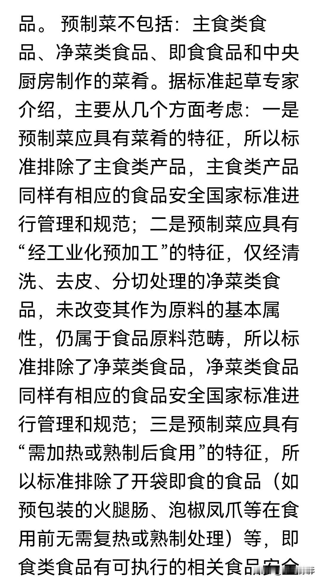 预制菜国家标:“中央厨房制作的菜肴不属于预制菜”。 感觉只要不是现炒现做的菜都应