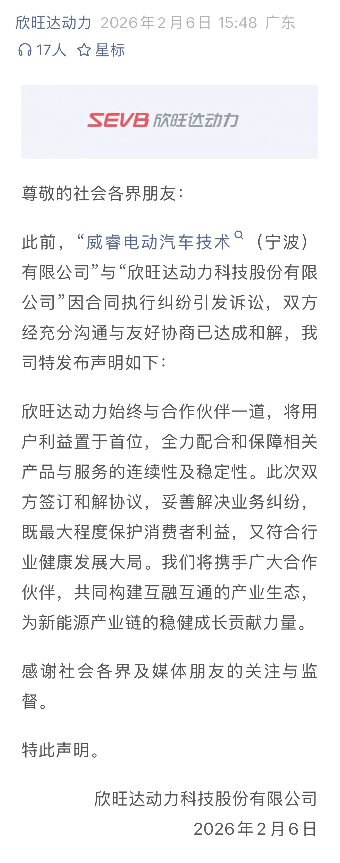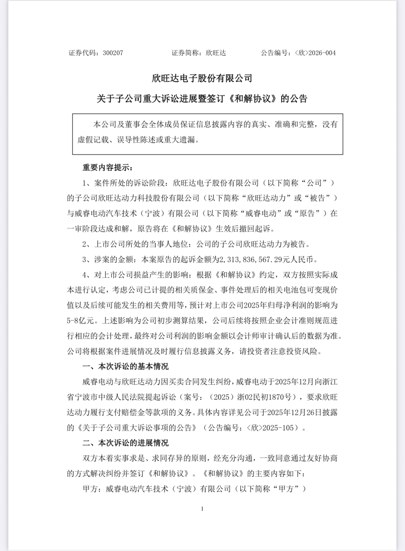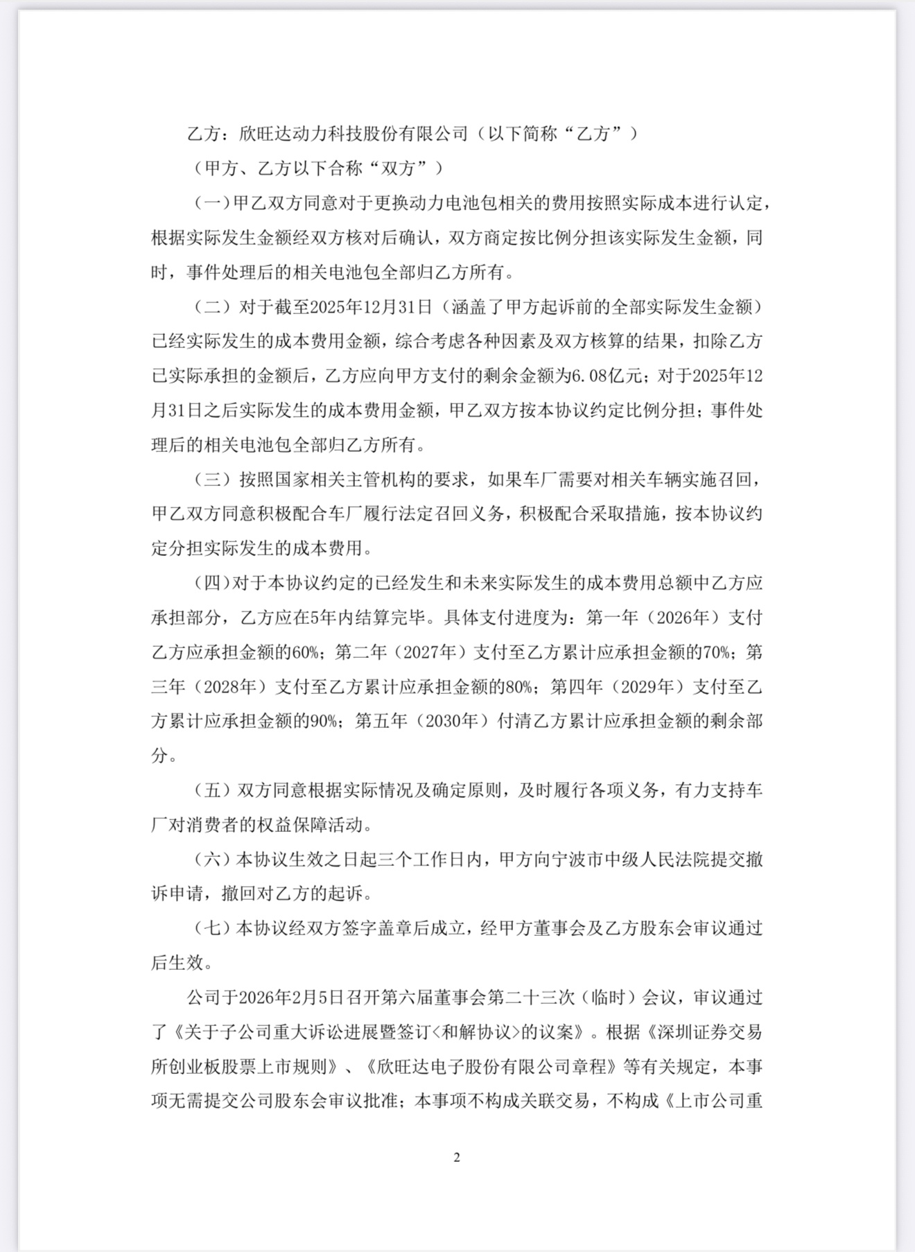 2025年12月,威睿电动以电芯未达技术标准为由,起诉欣旺达动力并索赔约23.14亿元;欣旺达则主张是充电策略与“锁电”操作影响了电池使用,双方各执一词。直到2026年2月5日,欣旺达召开董事会审议通过和解协议,次日披露细节:6.08亿前期剩余成本分五年分期支付,预估对2025年归母净利润产生5-8亿元影响。