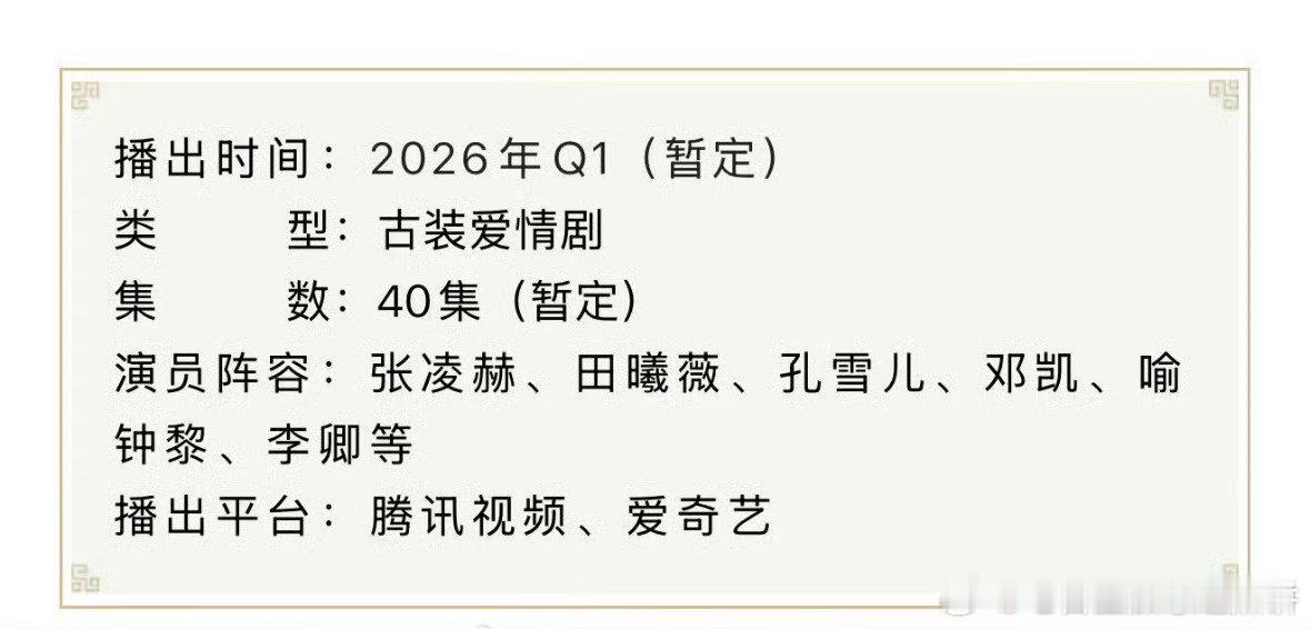 张凌赫 田曦薇逐玉招商 双平台40集 预计3月6日