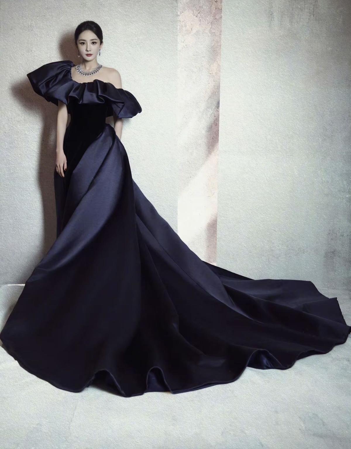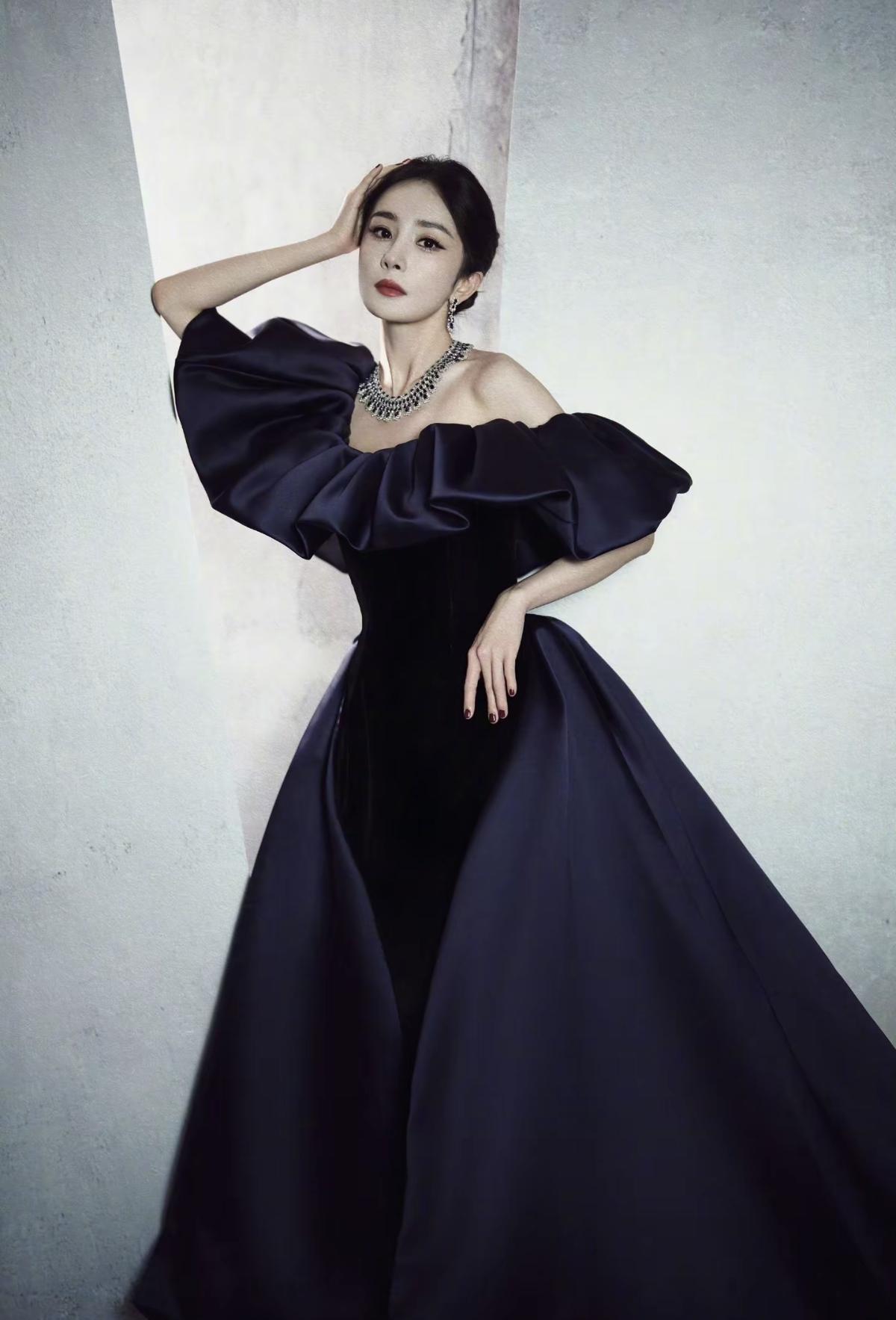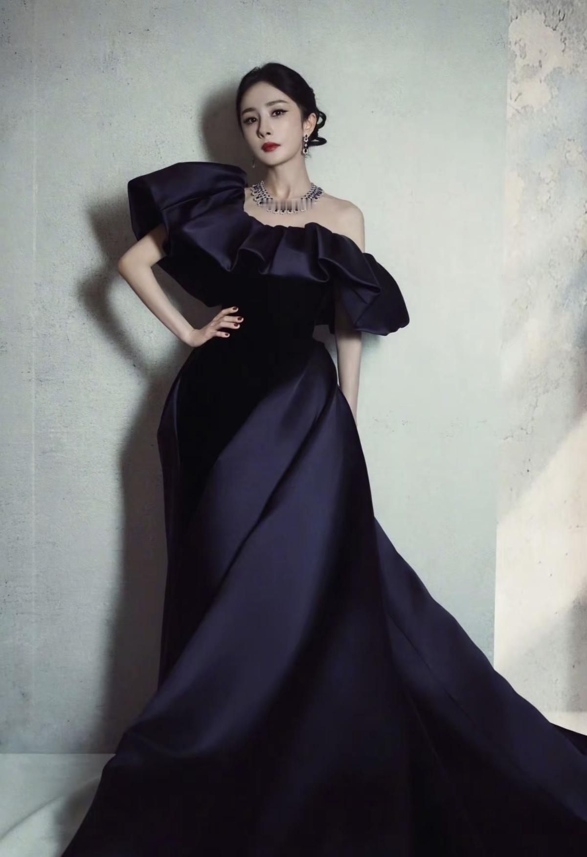 杨幂身着藏青色丝绒缎面拼接礼服亮相 大廓形露肩设计搭配奢华钻饰,尽显优雅大气的女王风范[比心][加一][玫瑰]娱乐明星
