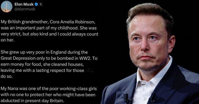 马斯克怀念祖母:我的英国祖母,科拉·阿米莉亚·罗宾逊,是我童年重要的一部分。她非常严厉,但也非常仁慈,我始终可以信赖她。