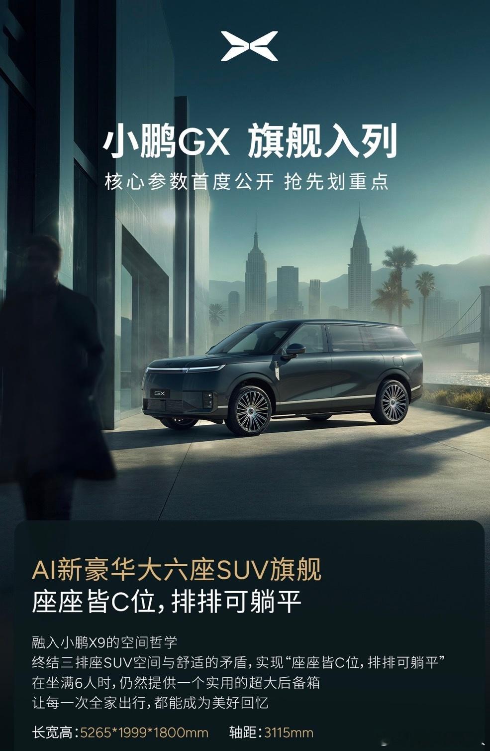 小鹏GX这波消息有点炸!何小鹏刚晒了新车图,直接官宣四五月就上市,而且L4级自动驾驶测试也已经安排上了。作为小鹏首款AI新豪华大六座SUV旗舰,尺寸直接拉满:5265×1999×1800mm,轴距3115mm,六座布局每一排都舒服,满员后备箱也能装下全家行李。再配上顶流的线控转向和后轮主动转向,大车开着也灵活,舒服又好开。科技感拉满,空间、操控全在线,妥妥的全家出行全能旗舰,这波真的可以狠狠期待住了!小鹏GX预计四五月上市小鹏GX已开始L4测试