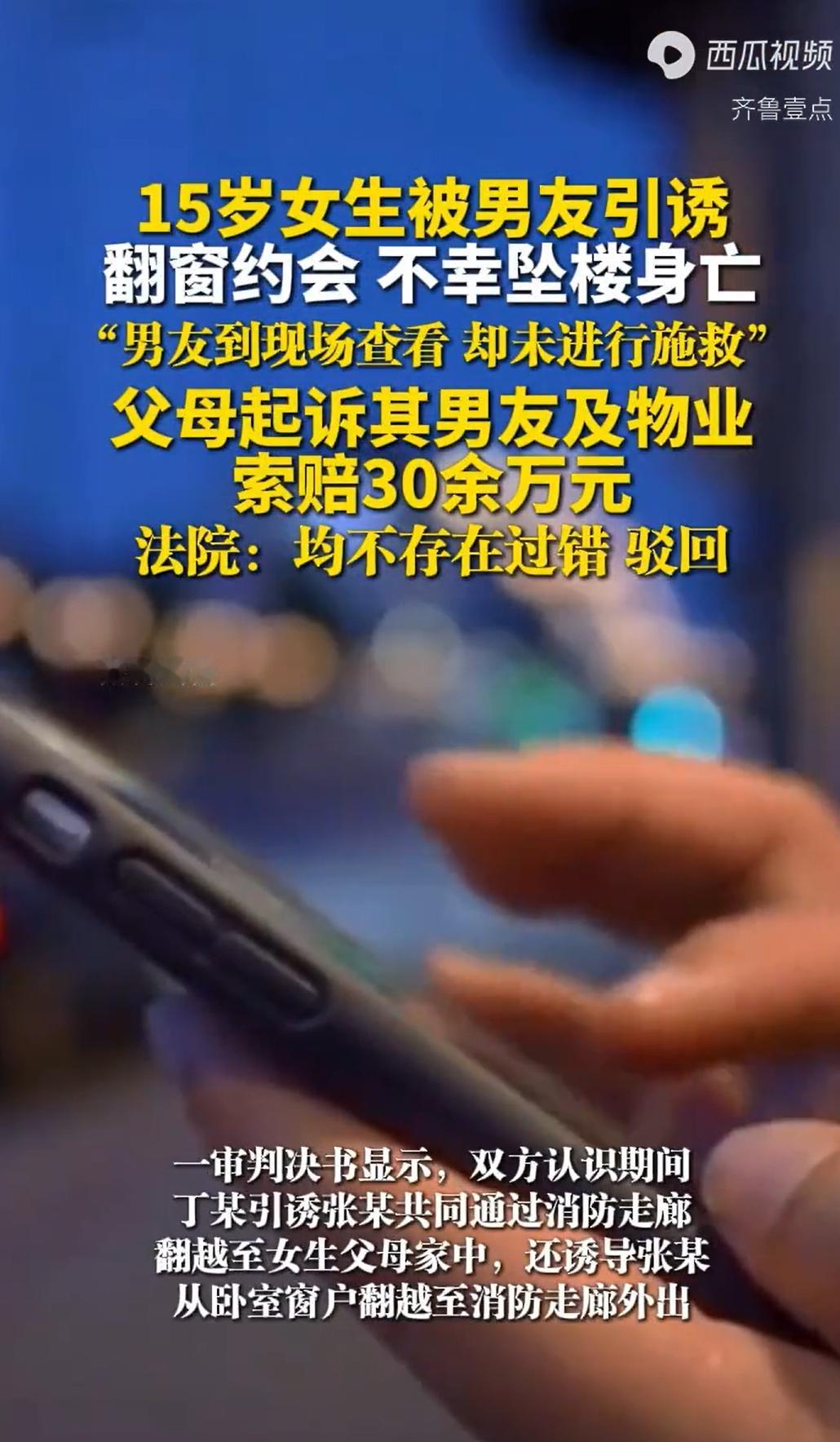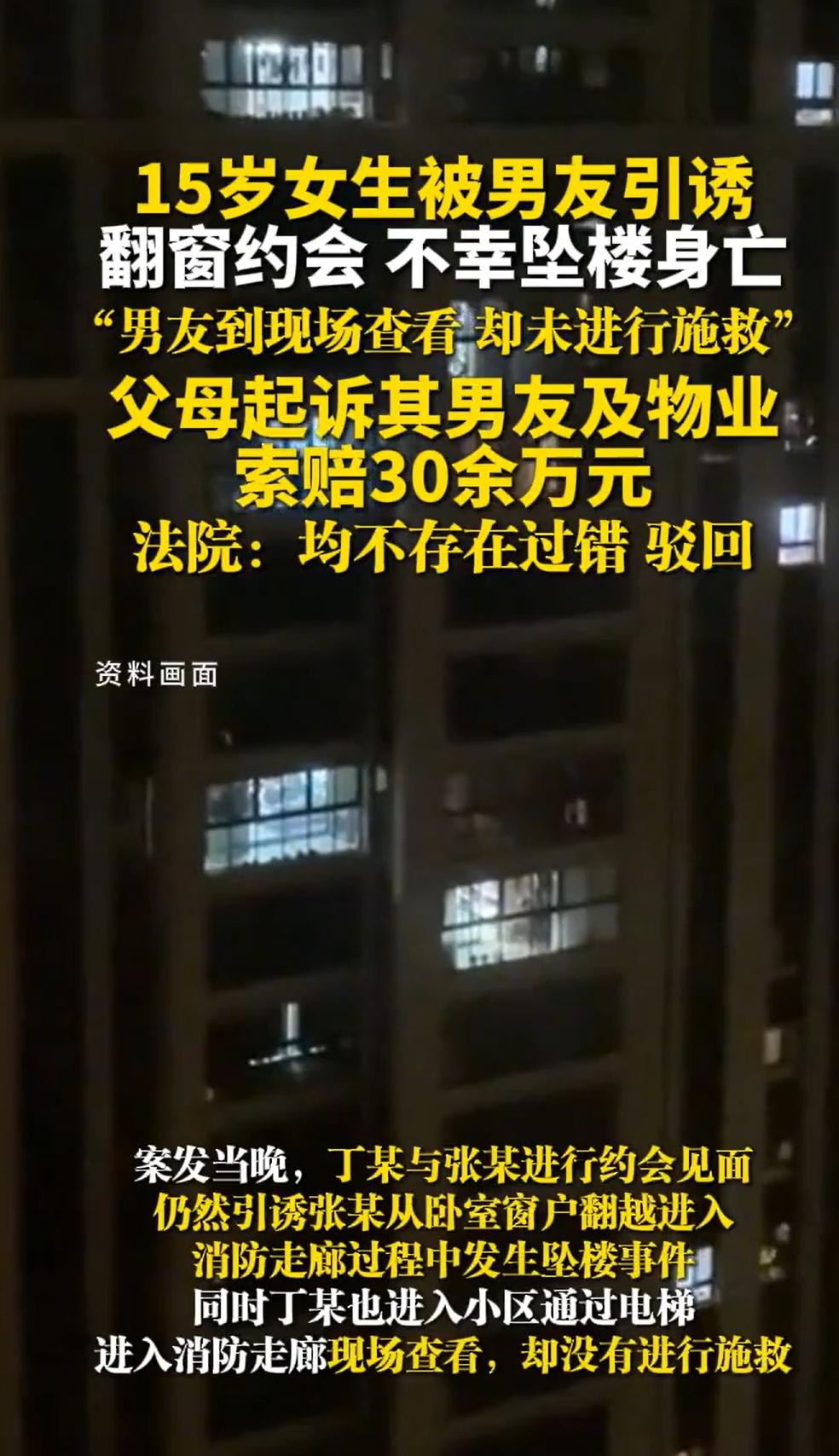 河南濮阳,一15岁女生和男友约好在楼下等,趁家人不注意,悄悄拧开卧室窗户,从窗户翻到连廊,再下楼碰面。不料,女生试图抓住栏杆的瞬间,突然身体失衡,从家中坠落,不幸身亡。女孩坠亡后,父母发现男友是通过社交软件认识女儿,还曾教她翻窗,他们认为,男友的引诱与物业未在连廊设防护,共同导致了本次悲剧。于是,女生的父母将男友与物业告上法庭,索赔三十余万。法院这样判决。 据悉,女孩张某出生在一个普通的工人家庭,父母常年忙于工作,对她虽然关心,但难免有疏于照看的时候。 进入青春期后,张某的性格开始变得有些叛逆,学习成绩平平,与父母的沟通也越来越少。 2025年初,张某通过社交软件认识了比她大几岁的丁某。 丁某已经成年,在当地一家小公司工作。 两人相识后迅速建立了恋爱关系,感情迅速升温,张某甚至曾与丁某有过短暂的同居生活。 张某家住在小区某栋楼的中间楼层,她卧室的窗户外面,是一条设计用于消防疏散的连廊。 事发当晚,丁某和张某约会,张某准备从自己卧室的窗户翻越到外面的消防连廊,然后通过连廊与丁某会面。 这种方式他们已经不是第一次使用。 根据张某父母陈述,丁某曾经引诱张某共同通过消防走廊翻越至女生父母家中。 当晚约9点左右,张某开始了她的翻越,小心翼翼地打开窗户,试图抓住外面的栏杆。 然而就在这个过程中,张某失手从窗户坠下,重重地摔在了楼下的地面上。 此时,丁某已经通过电梯来到消防连廊等待,当他发现张某迟迟没有出现时,便四处寻找,最终发现了坠落在地的张某。 丁某立即拨打了急救电话,但一切为时已晚。 张某被紧急送往医院,经抢救无效身亡。 女儿的突然离世给张某的父母带来了巨大的打击。 在料理完后事后,张某父母一纸诉状将丁某和小区物业公司告上法庭,要求两被告共同赔偿各项损失共计30余万元。 在起诉状中,张某父母提出了以下主要理由: 第一,丁某作为成年人,与尚未成年的张某建立恋爱关系,并在案发当晚“引诱”张某从卧室窗户翻越,导致悲剧发生。更严重的是,丁某发现张某坠楼后没有及时施救,存在重大过错。 第二,小区消防连廊与卧室窗户距离过近,且未设置任何安全警示标志和防护设施,物业公司没有尽到安全保障义务。 此外,小区门禁系统未能成功拦截丁某进入,也说明物业在安全管理上存在疏漏。 接到传票后,丁某表示,他与张某是正常恋爱关系,从未强迫或引诱张某从事危险行为。案发当晚,他只是如约与张某见面,并没有要求张某从窗户翻出。发现张某坠楼后,他第一时间拨打了急救电话,已经尽到了救助义务。 小区物业公司则强调,小区的所有设计和施工均符合标准,且已通过相关部门验收合格。消防连廊栏杆的高度、与窗户的距离均符合消防规范要求。 物业公司认为,张某作为一名15岁的未成年人,已经具备一定的危险认知能力,应当为自己的行为负责。 同时,张某的父母作为监护人,没有尽到足够的监护责任,应当承担相应后果。 法院会如何判决呢? 《民法典》第一千一百六十五条规定,行为人因过错侵害他人民事权益造成损害的,应当承担侵权责任。 《民法典》第一千一百九十八条规定了公共场所经营者、管理者的安全保障义务,但其义务范围应限定于其管理和控制的公共区域及共用设施。 法院指出,张某是从其父母家中自有物业的卧室窗户翻出,其行为的起始点和危险源均发生于业主的专有部分内部,而非小区的公共通道、楼梯、大堂等区域。 消防连廊虽为公共设施,但其设计用途是消防疏散,符合国家强制性标准并通过验收,要求物业公司对业主室内的窗户布局、业主家庭成员从室内翻窗的行为进行管控和防护,已经明显超出了物业服务合同约定的管理范围,也超出了法律规定的合理注意义务限度。 根据民事诉讼中谁主张、谁举证原则,张某的父母未能提供证据证明涉案房屋及消防连廊的设计、施工存在违法或不合格之处,理应承担举证不利的后果。 同时,张某父母未能证明其与物业公司签订的《前期物业服务协议》中,包含了“必须在消防连廊设置针对翻窗行为的警示标志”或“门禁系统必须拦截所有访客”的约定义务。 法院认为,物业公司的管理行为并未违反法定或约定义务,主观上不存在疏忽或懈怠的过失。 此外,现有证据仅能证明丁某与张某为恋爱关系并约定见面,无法证实丁某在案发当晚实施了具体的、教唆性的危险指令。 而丁某在发现情况后已拨打急救电话,履行了基本救助义务。 虽然丁某作为成年人与未成年人交往在道德上值得商榷,但张某作为已满15周岁的限制民事行为能力人,对高空翻窗行为的危险性具备基本认知能力,其自主决定并实施该行为,是导致损害发生的直接和根本原因。 最终,法院判决驳回了张某父母的全部诉请。 对此,您怎么看?