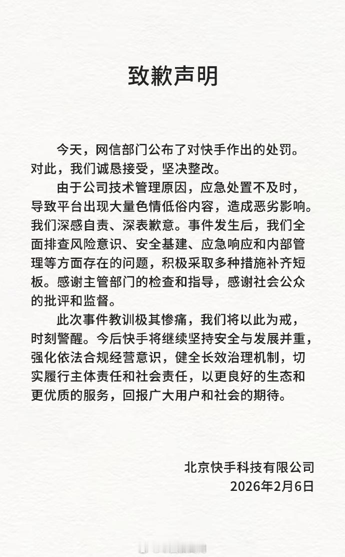 北京市互联网信息办公室依据《中华人民共和国网络安全法》《中华人民共和国行政处罚法》等法律法规,对北京快手科技有限公司处警告、1.191亿元人民币罚款处罚,同时责令其限期改正、依法依约处置账号、从严处理责任人。