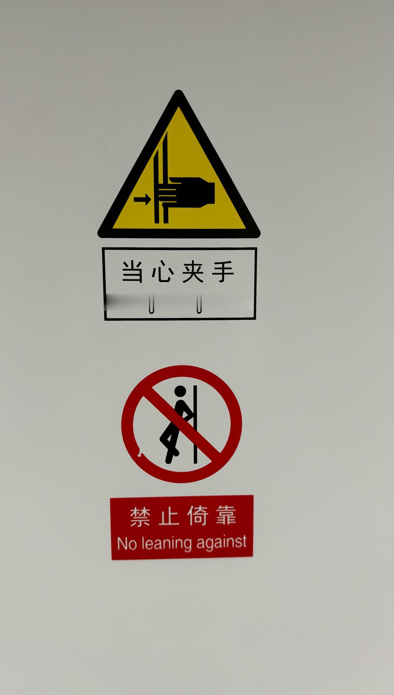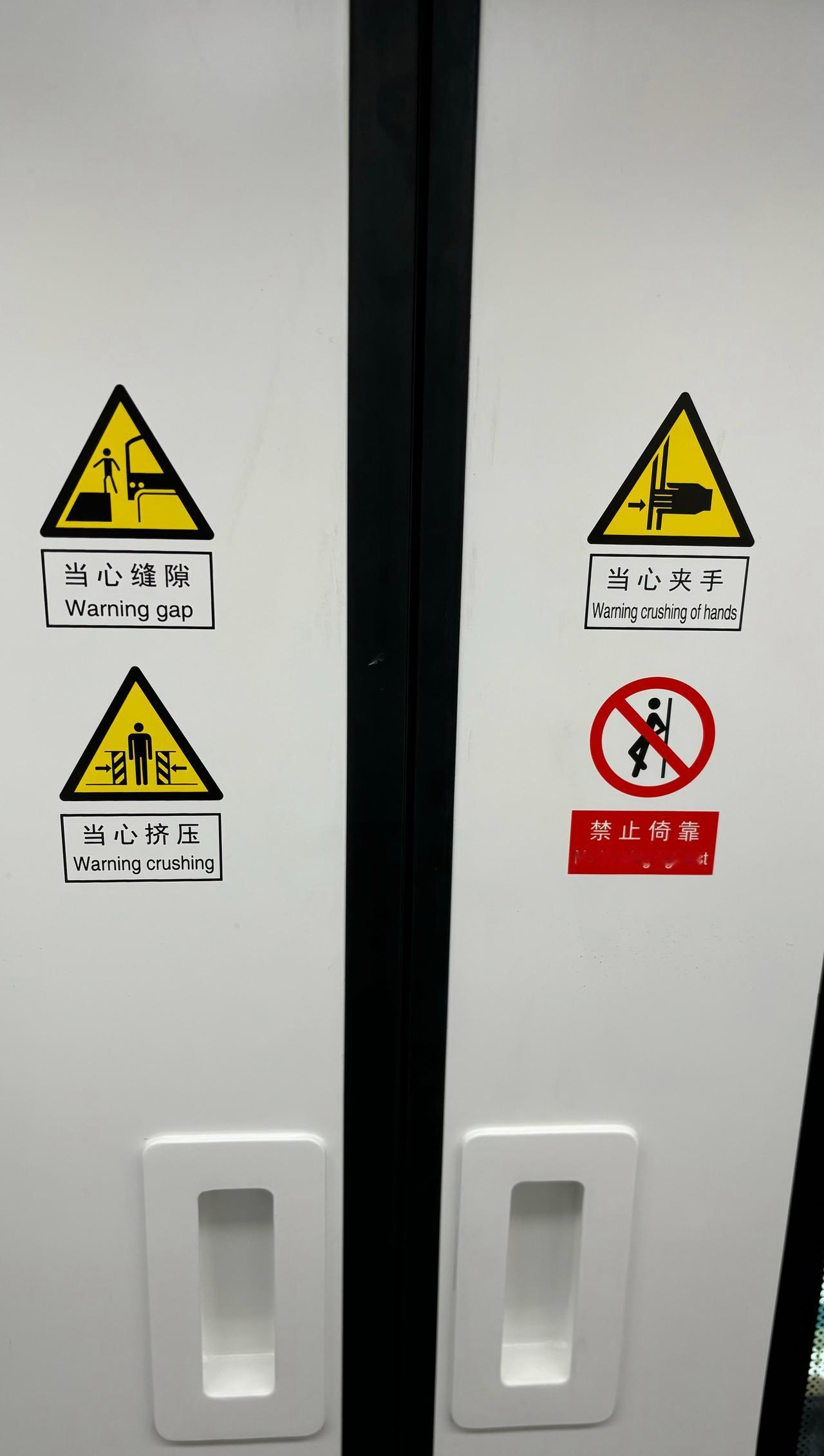 【青岛地铁啄木鸟】𝟓𝟏𝟑𝟑.列车 图1/图2/图3:8号线(增购车)、2号线(增购车)、三期线路列车车内标识问题 ①“禁止倚靠”: 英文有“against”,与地铁站台门新增加的贴纸为规范的国标英文没有“against”不一致(图4) ②“禁止倚靠”: 图形里的小人胳膊与墙面形成三角形,与地铁站台门新增加的贴纸为规范的国标,小人胳膊没有与墙面形成三角形不一致(图4) ③“当心夹手”: 英文与地铁站台门新增加的贴纸为规范的国标英文“Warning. Hands Pinching”不一致(图4) ④“当心夹手”: 图形与地铁站台门新增加的贴纸图形为规范的国标(手为白黑手➕没有右箭头➡️)不一致(图4) ⑤“当心夹手”、“当心挤压”顺序应挨着一起上下排列,应与地铁站台门新增加的贴纸排列顺序(“当心夹手”、“当心挤压”左右排列)保持一致(图4) 涉及英文不一致、图形不一致问题应先行修改还在质保期内的增购车、三期线路列车,并详尽写进规范,既有线路随着大修调整 ————————————————————
