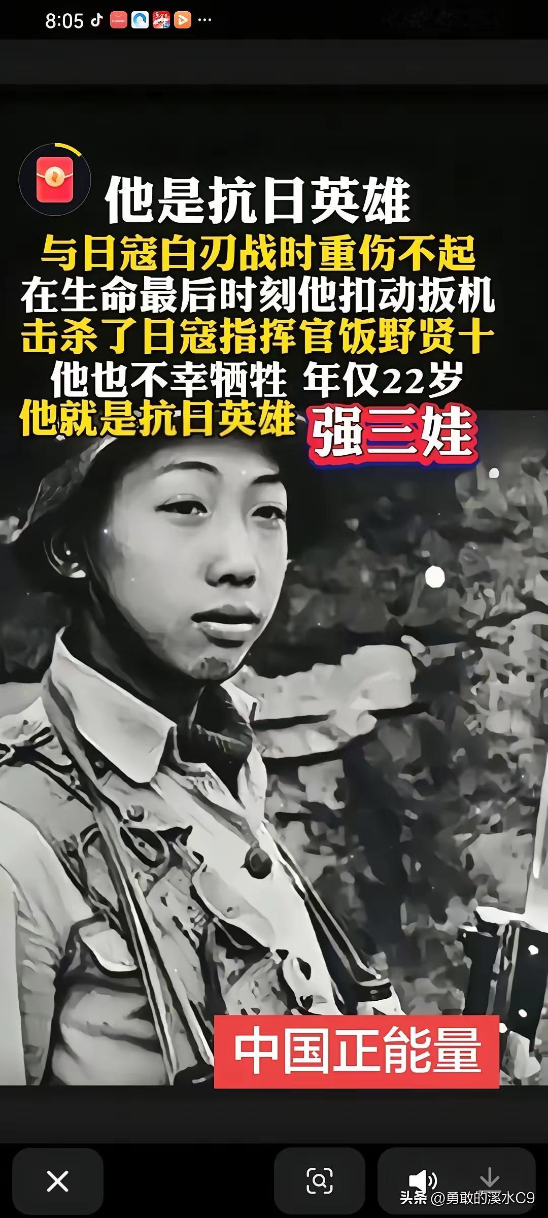 强三娃,一个年仅二十二岁的抗日英雄。在那场惨烈的白刃战中,他身负重伤,连起身都成了奢望。但他骨子里的坚毅,让他在生命的最后一刻爆发出惊人的力量。 面对日军指挥官板野贤十,他拼尽最后一丝力气扣动扳机。随着那一声枪响,板野贤十被击毙,而强三娃也永远地闭上了双眼。 在那段艰苦的抗战岁月,像强三娃这样的英雄数不胜数,他们用生命换来了我们如今和平的生活。我们必须缅怀这些英雄,铭记曾经的血泪之仇,让英雄的精神永远传承下去。