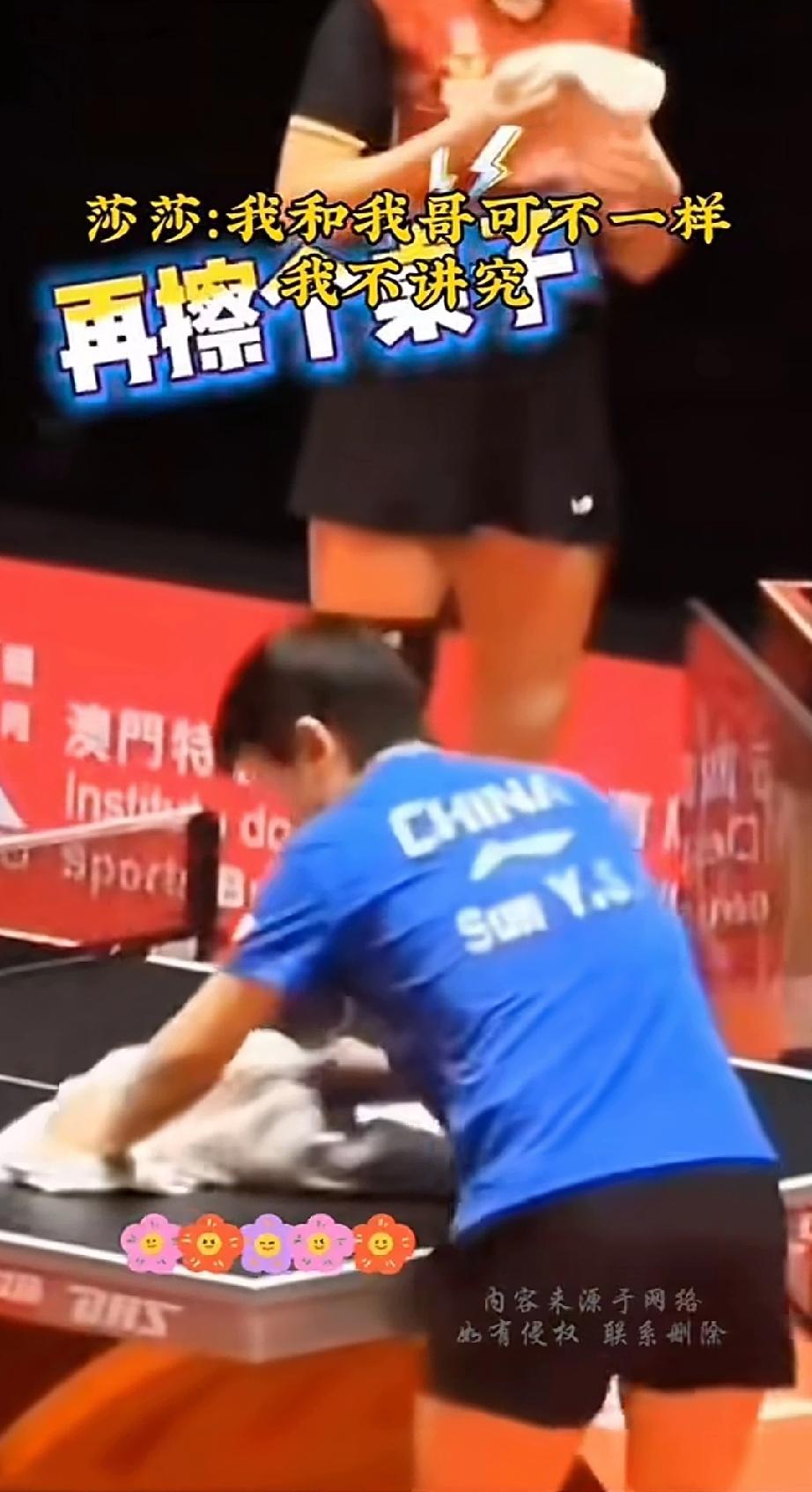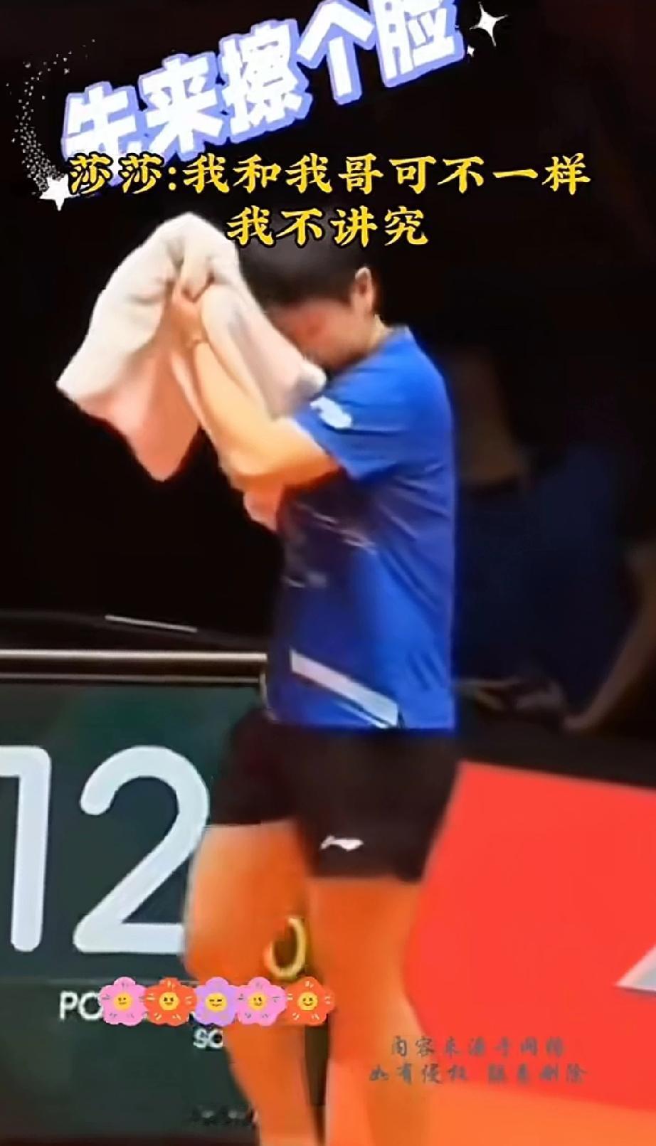 莎莎你这洒脱的性格太讲究了! 莎莎拿起自己的白毛巾先擦脸,然后脖子,走几步到球台旁边,认真的擦起了桌子。返回来,接着擦脸。 哈哈,莎莎,你可真讲究,擦脸和擦球台都能用一个毛巾呀。真是做大事不拘小节,这是个万能的毛巾呀!