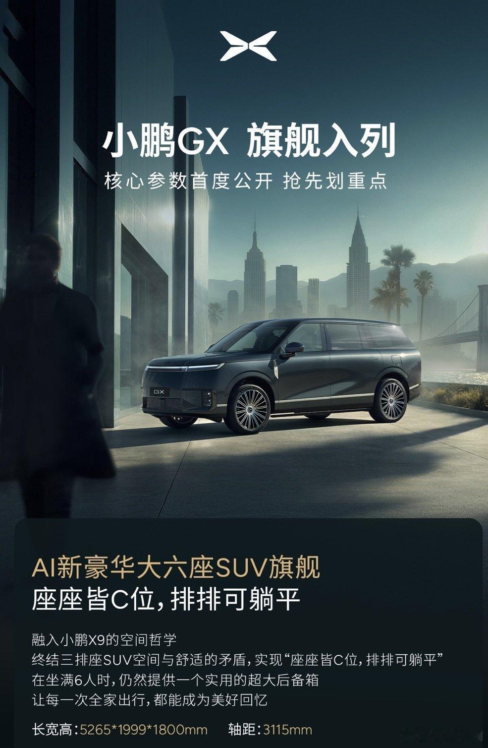 根据工信部的信息,小鹏GX车身尺寸为5265*1999*1800mm,轴距3115mm,配备线控转向与后轮主动转向技术,能让大车开出小车感,更舒适好开。